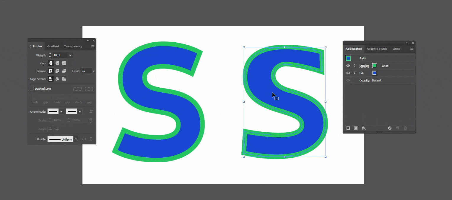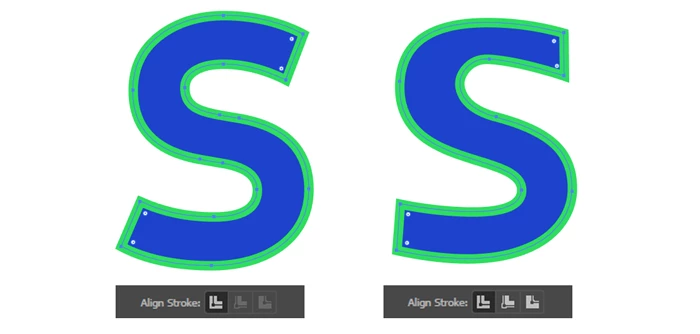 The stroke alignment options are disabled for the S on the left, but they function properly for the S on the right.