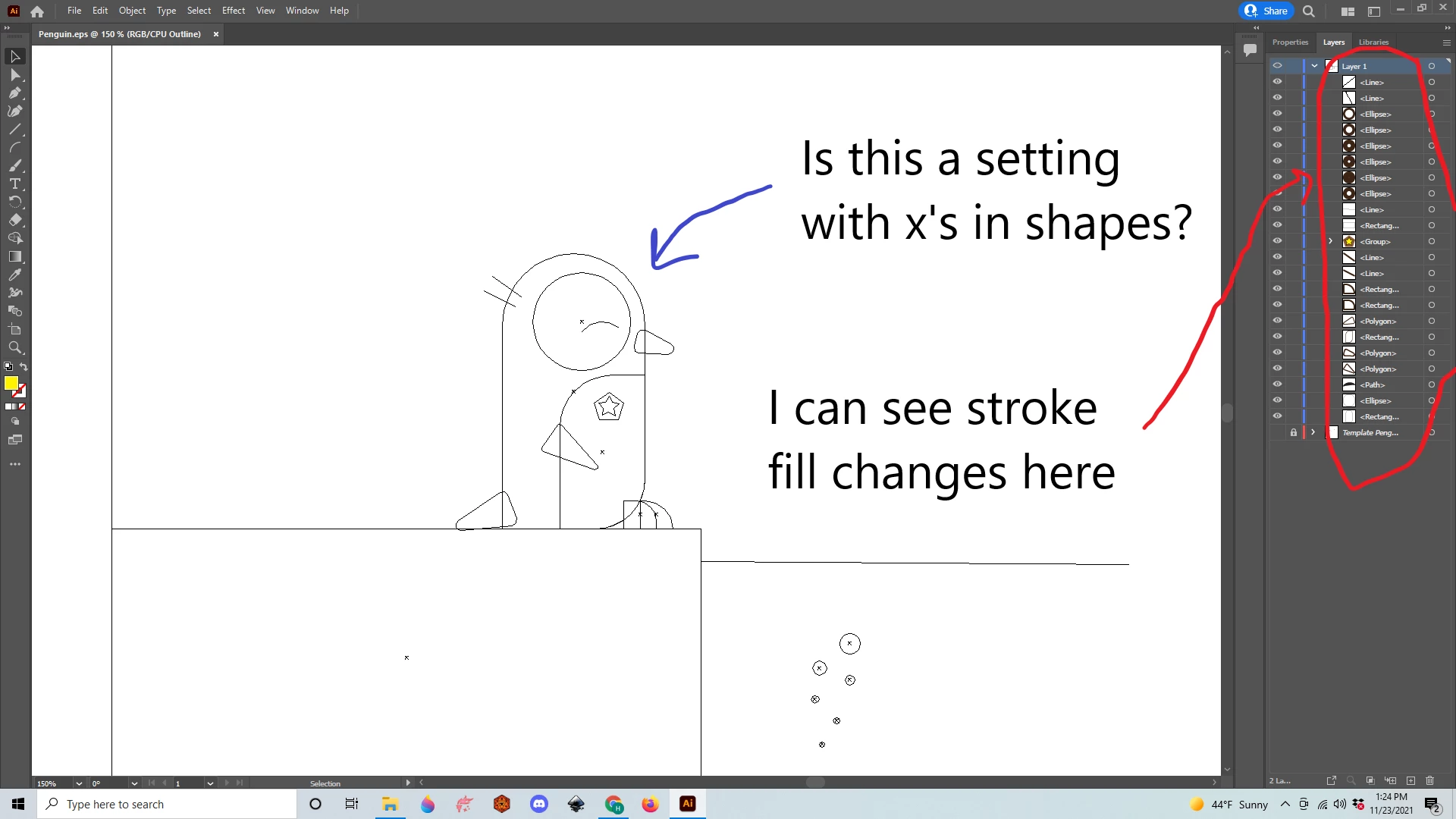 I am extremely new, I have literally just opened illustrator and began a tutorial for beginners. Previous experience using inkscape I know a little bit about stroke and fill. I looked at other questions asked in this communtiy, but their solutions do not seem to solve the problem. My stroke and fill will not change on the artboard. It does change in the preview of layers and stuff on the right side. I don't know of a reason it wouldn't be showing so I'm not sure if something is active/selected that I've never seen, or maybe a layer problem? I can't seem to figure it out. It seems all my shapes have x's in the middle so I know something's up. So any help would be appreciated. I would love an answer from someone who can explain the problem so I can make sure that I can prevent it in the future that would be really helpful as well. Thank you so very much.