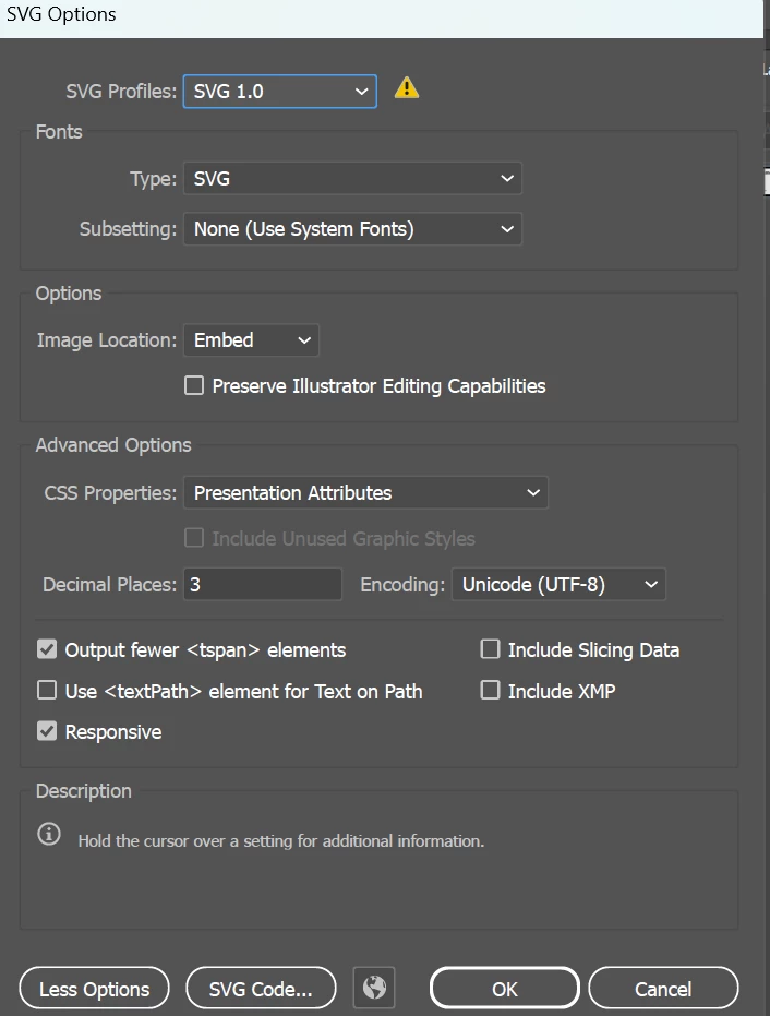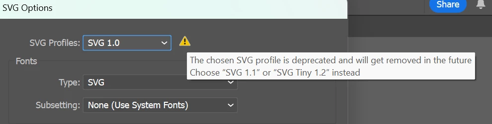 We have also another doubt and issue for Adobe CC, while saving the SVG image it asks SVG 1.0 and SVG1.1 etc.. in SVG profiles