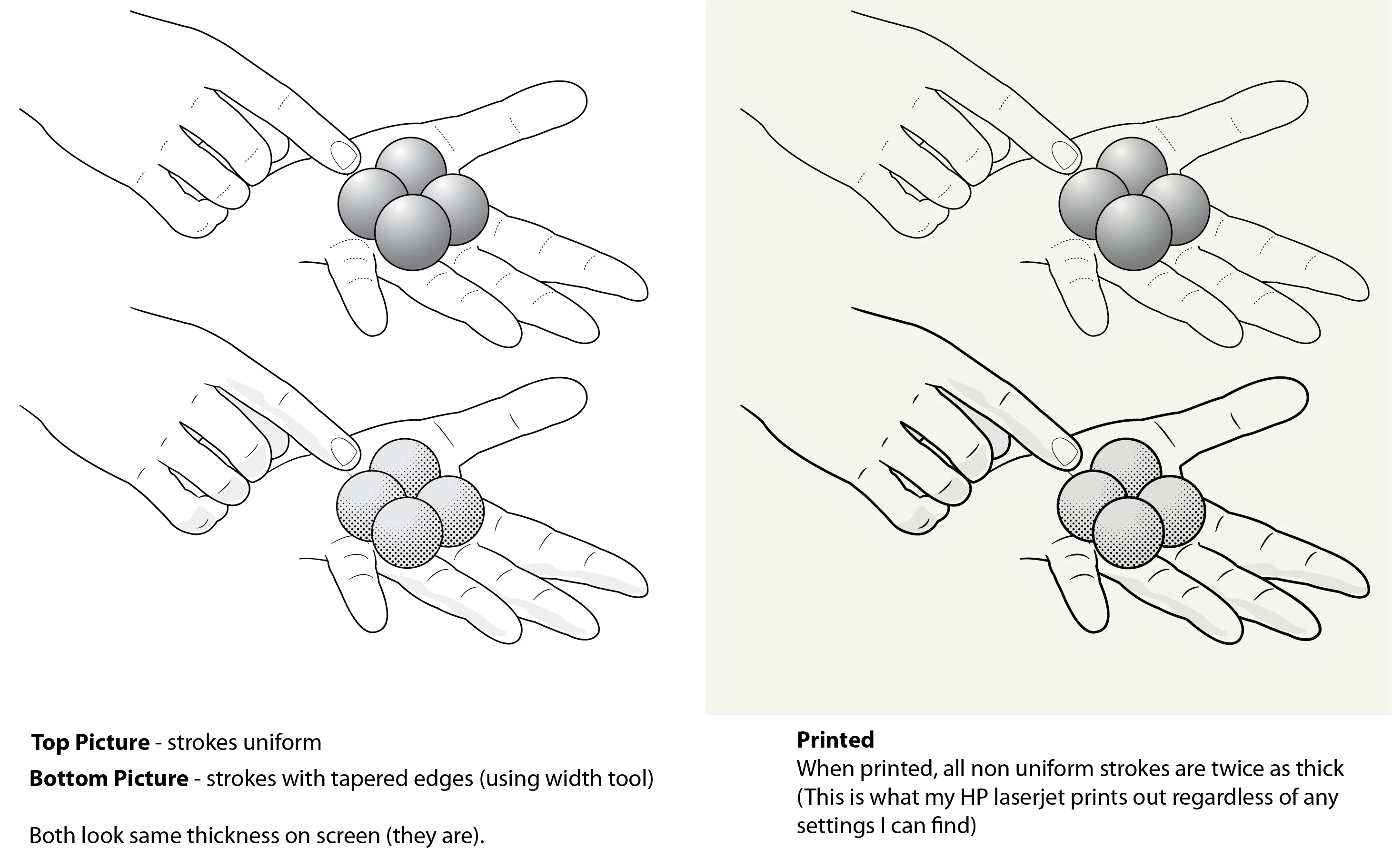 I've recenly been playing with the Width Tool to make some illustrations look a little less computer generated. I'm tapering the ends and using a few stroke styles rather than the standard "uniform" strokes. Onscreen, the lines are exactly the same thickness as my previous illustrations. But, when I print to my laser jet, any non-Uniform strokes print twice the thickness. Is this is glitch or am I mssing a setting? Uniform strokes print perfect, anything else prints thick.