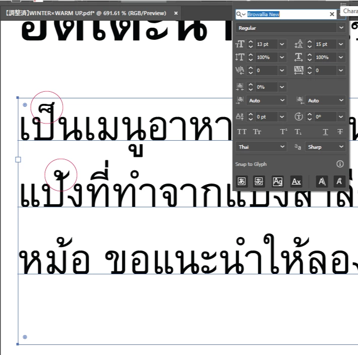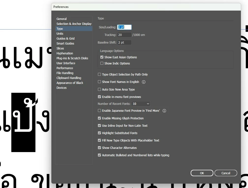 I have the text box language set to Thai and "Show East-Indian Preferences" is ticked in Preferences > Type.