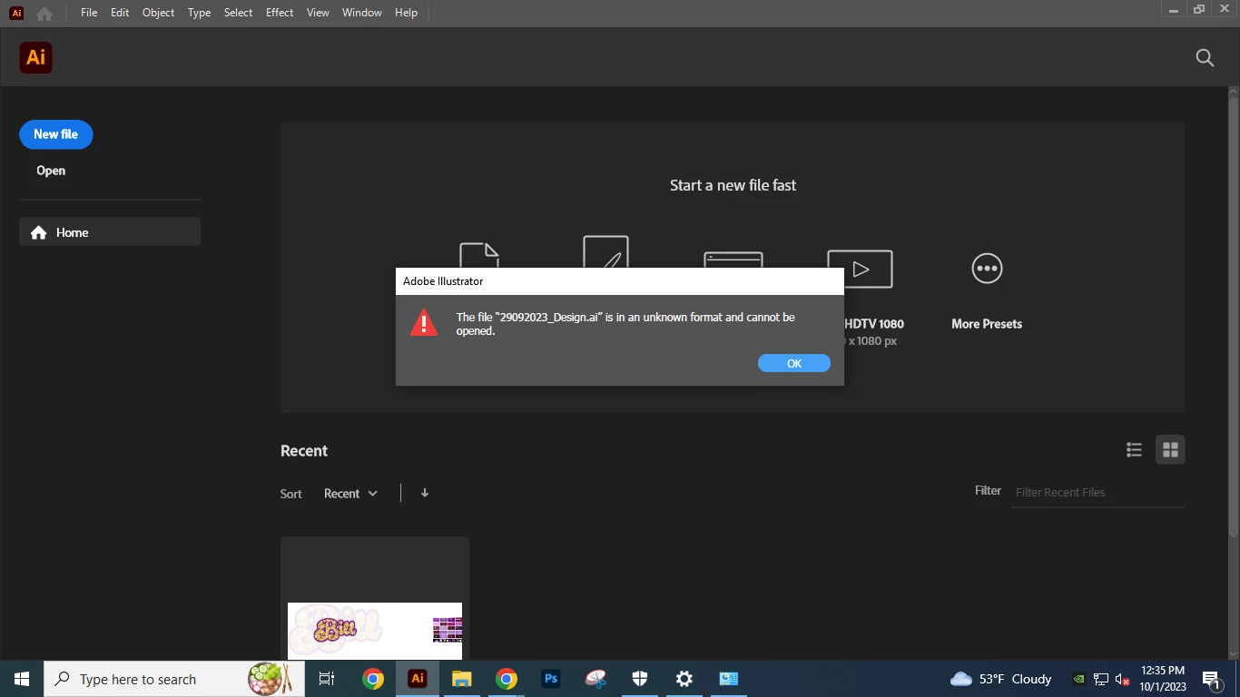 Now when i'm open it on my illustrator it says an error " the file is an unknown format and cannot be opened illustrator" even it's has file size of 52,306 KB.