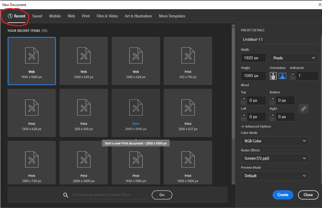Step 2: In top left there have option (Recent, Web, print, etc..)
