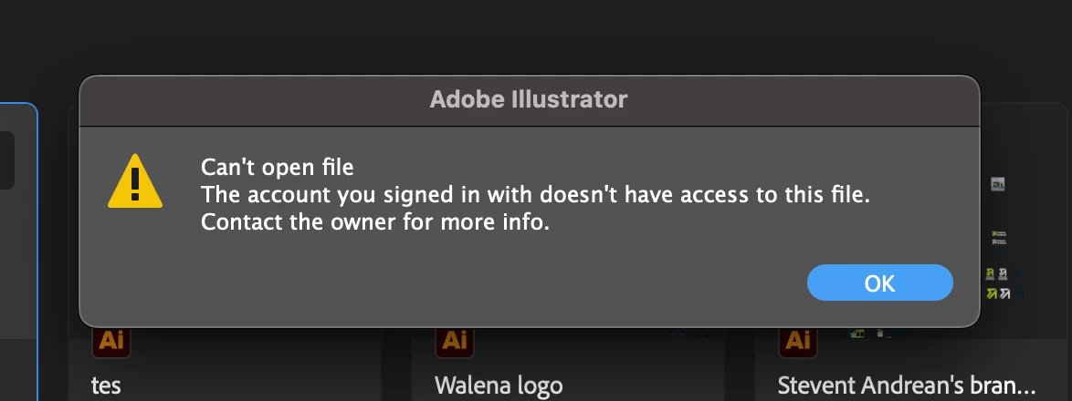 This happens every time I try to save to the cloud: "Can't open file. The account you signed in with." Stable wifi, original account, no multiple logins, re-logged, restarted Mac, Illustrator 2026. I am the file owner.