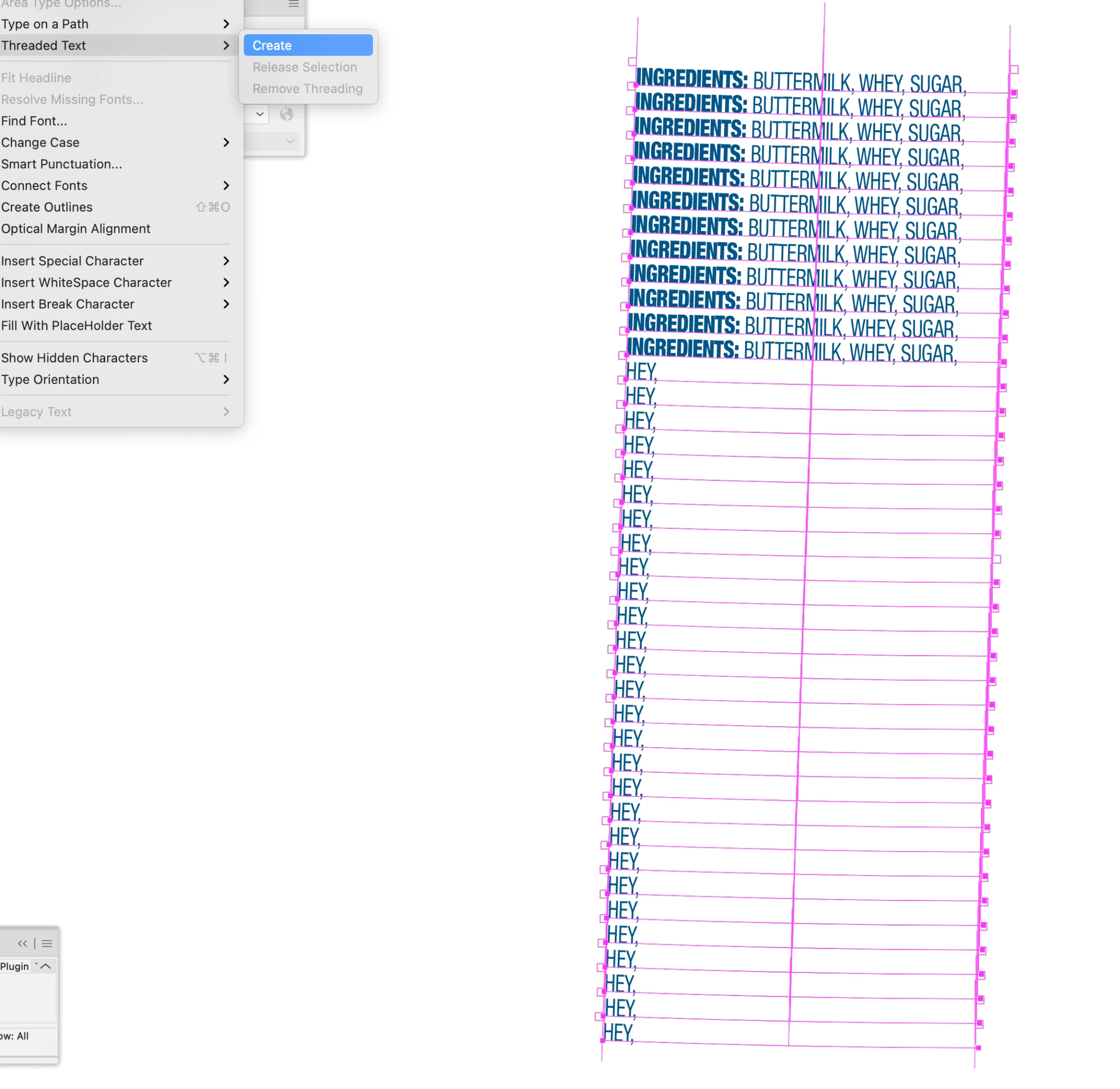 I am trying to thread text on multiple curved lines for an ingredient listing for packaging. Due to the package structure, 23 lines of text have to individually be applied using type on path. I wanted to thread all of these lines so that I can seamlessly type ingredient listings for other flavors. However, when I select the curved lines that already have text applied to them and thread them, the thread jumps around instead of going in order. I tried individually selecting each out port to link to the next text line, but it isn't working. Is this a bug?