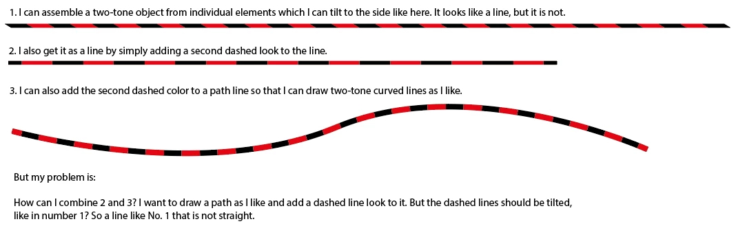 How can I combine 2 and 3? I want to draw a path as I like and add a dashed line look to it. But the dashed lines should be tilted, like in number 1? So a line like No. 1 that is not straight.