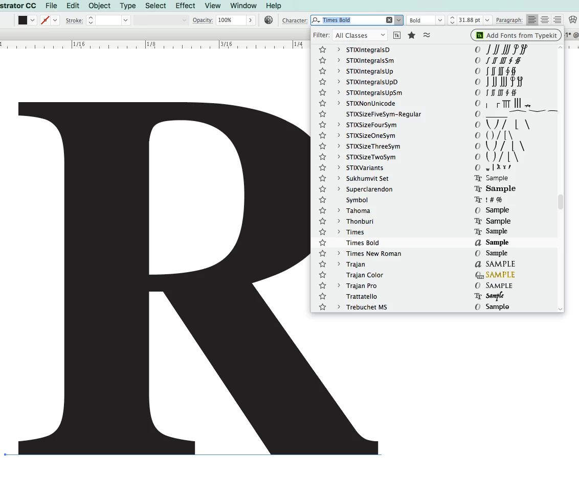 Times Roman Bold font design different in Illustrator