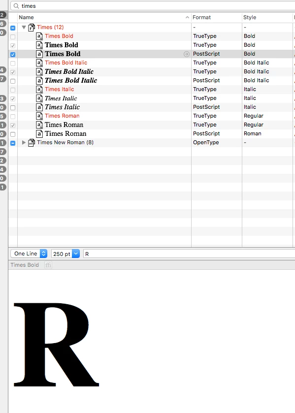 I still find it strange why Adobe Illustrator can't render the Mac OS Times.dfont properly when others can. Is this a localized issue or are other .dfont or other fonts not rendering properly? (at first glance, I don't think anyone would question the R looking odd in a sentence. It was just a curiosity that lead to finding this inconsistent font issue... Just curious now if any other fonts have this issue.
