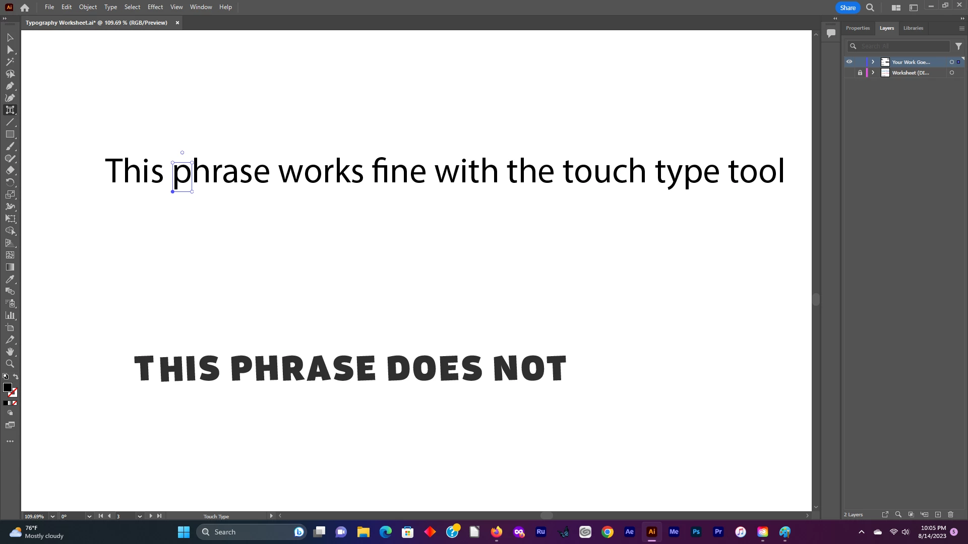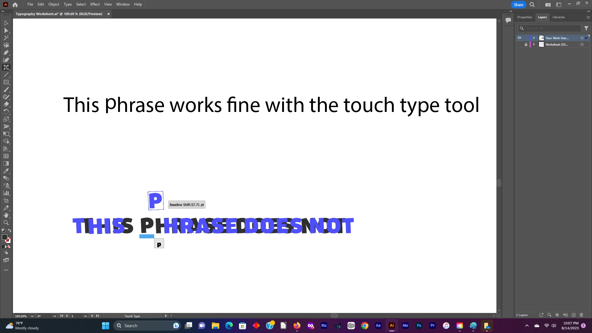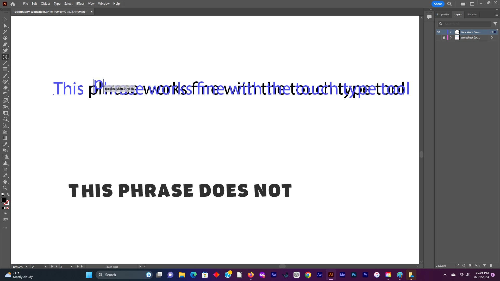 I'm having a problem with the touch type tool wherein it keeps moving all of the characters in a word, instead of leaving all characters, perceding the selected character, alone. I do not know how to lock those first characters in place, or what setting I need to fix to get the little 'x' to appear at the bottom left of the first character in the word/ phrase. I've attatched pictures to illustrate what I'm talking about. Any help would be greatly appreciated.