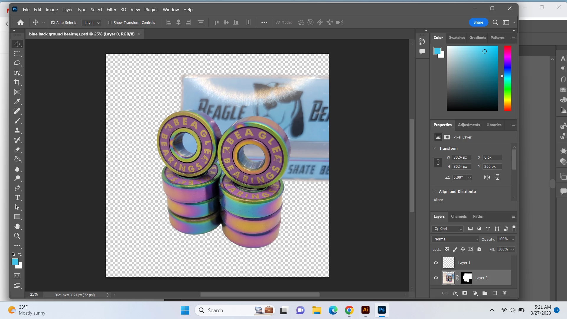 Hi, I am transferring a transparent background from photoshop to illustrator but everytime I transfermit to illsutrator a white box shows up on my product. I want it to be transparent so it matches with the blue background.