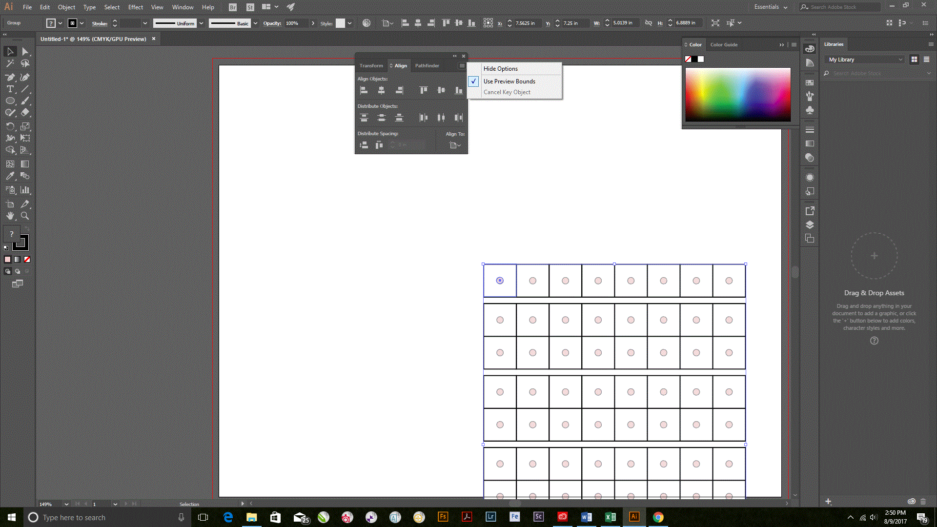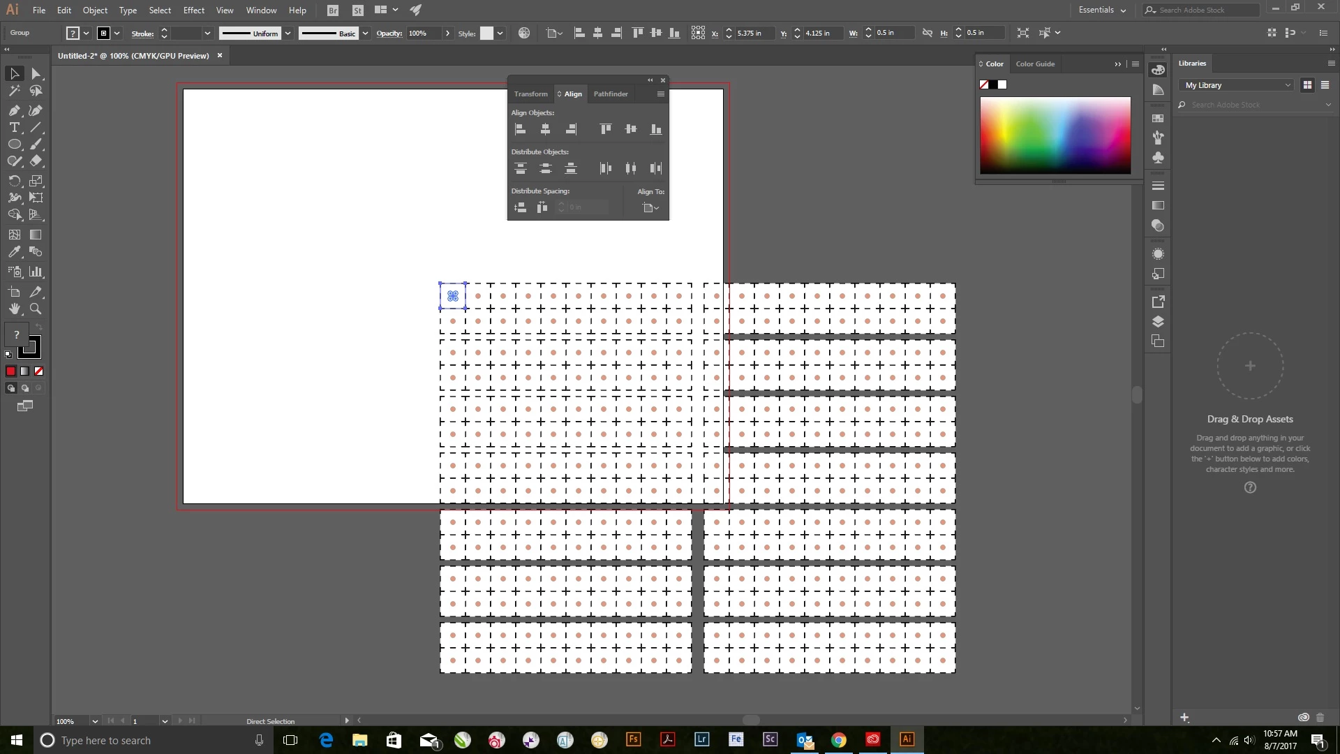 So I created a 1/2" square, transformed it into a row of 10 half-inch squares, transformed that again into two rows one on top of the other (20 squares at this point); I Transformed again into 9 groups with 1/8" spacing in-between for the sprue, finally transforming again twice (both halves together on an 8.5 by 11 sprue). Now the problem: in adobe Cs6 I was able to click horizontal & vertical align and the entire 3-level tranformation centered properly on the artboard, but in adobe CC I have been running into problems as it will not center properly (it only centers the original pre-transformed half-inch square, but not the entire completed transformation [again, which it did do properly in Cs6]). i found a workaround which I don't like: basically creating another rectangle object which I use to cover the entire transformation (I have to use the selection tools & the greatest zoom to insure that it perfectly matches the transformation), and then group the two. Then I can align vertically and horizontally (I can get rid of the un-needed extra rectangle at this point). There is the possibility of human error in this method (even if I do zoom at the highest level), so I don't care for it even though it would probably work (I imagine any error would be so minute as to be negligible). But, I would prefer exact/perfect alignment using existing align tools. I just don't know how to do this in CC (as I mentioned before, it doesn't seem to work the same way as it did in Cs6).