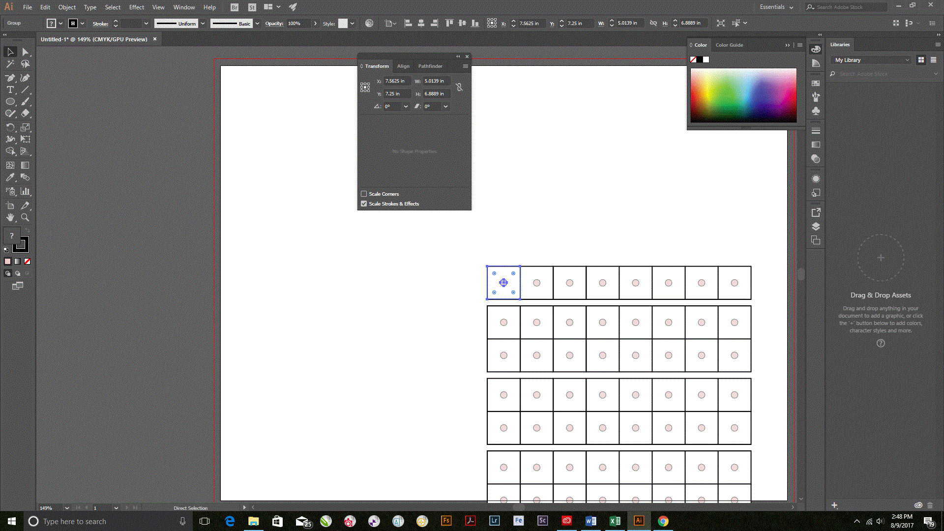 I created a 3 level transformation of squares. I need to create a "sprue" of counters that will eventually be used in a strategy board game for a kickstarter project that I eventually will start. This counter sprue needs to be absolutely aligned correctly (they will be printed on both front and back) as it will eventually go to a die cutter for printing on chipboard (or rather pasted onto the chipboard & then die cut .... I'm not 100% sure how this process works, but I do know that it is essential that the counter sprue art to be aligned extremely precisely).