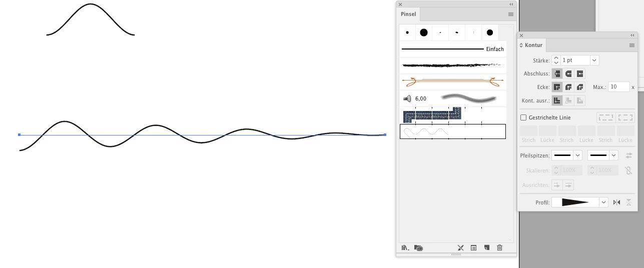 Create the wave as a pattern brush and then apply to the path together with a width profile in triangle shape.