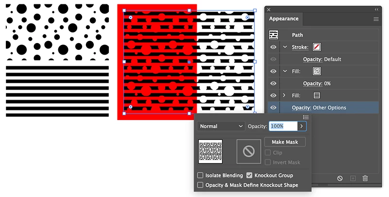 Example I have a shape filled with a solid color or pattern, then I copy in place a duplicate of the shape and fill it with my blob pattern. I would like the blobs to act as a transparency mask to "cut holes" in the original underlying shape.