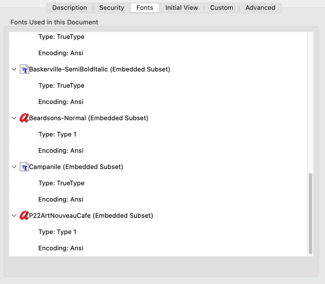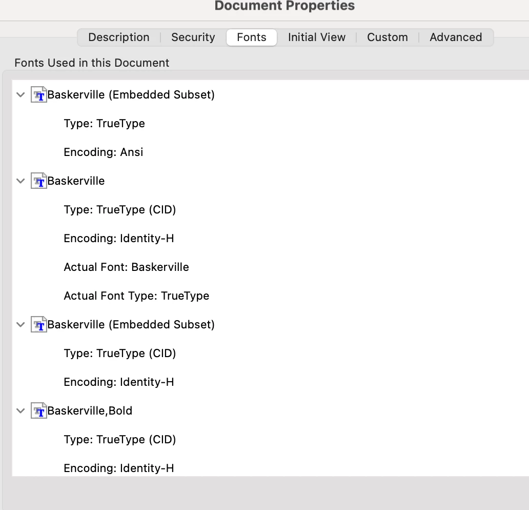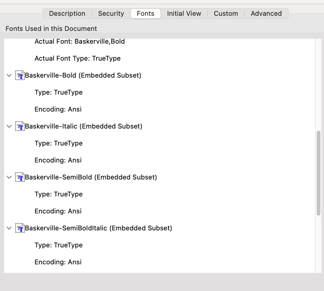 I'm not great at illustrator or acrobat for menus. SO ...here are some pictures ot the document properties in acrobat. They state that the fonts are embedded subsets. I can use the Typeface as regular, bold, and italic , but when I got to the drop down menu to change it to semi bold I have a problem, it is not there, it only says the type face name - baskerville. It does not even say Baskerville bold or Baskerville italic.
