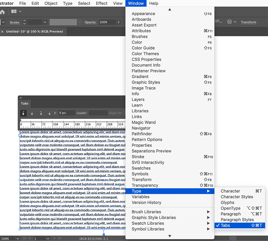 I'm trying to set tabstops for text and according to Adobe instructions I should be able to do so in Window>Type>Tabs. However, I have no options for tabs in my Type dropdown. Where should I go for this, or how to get this to appear in my dropdown. Thanks