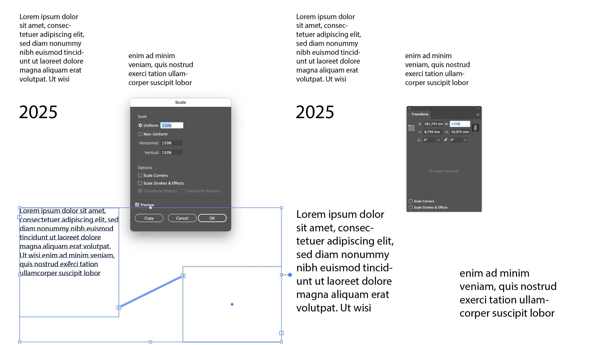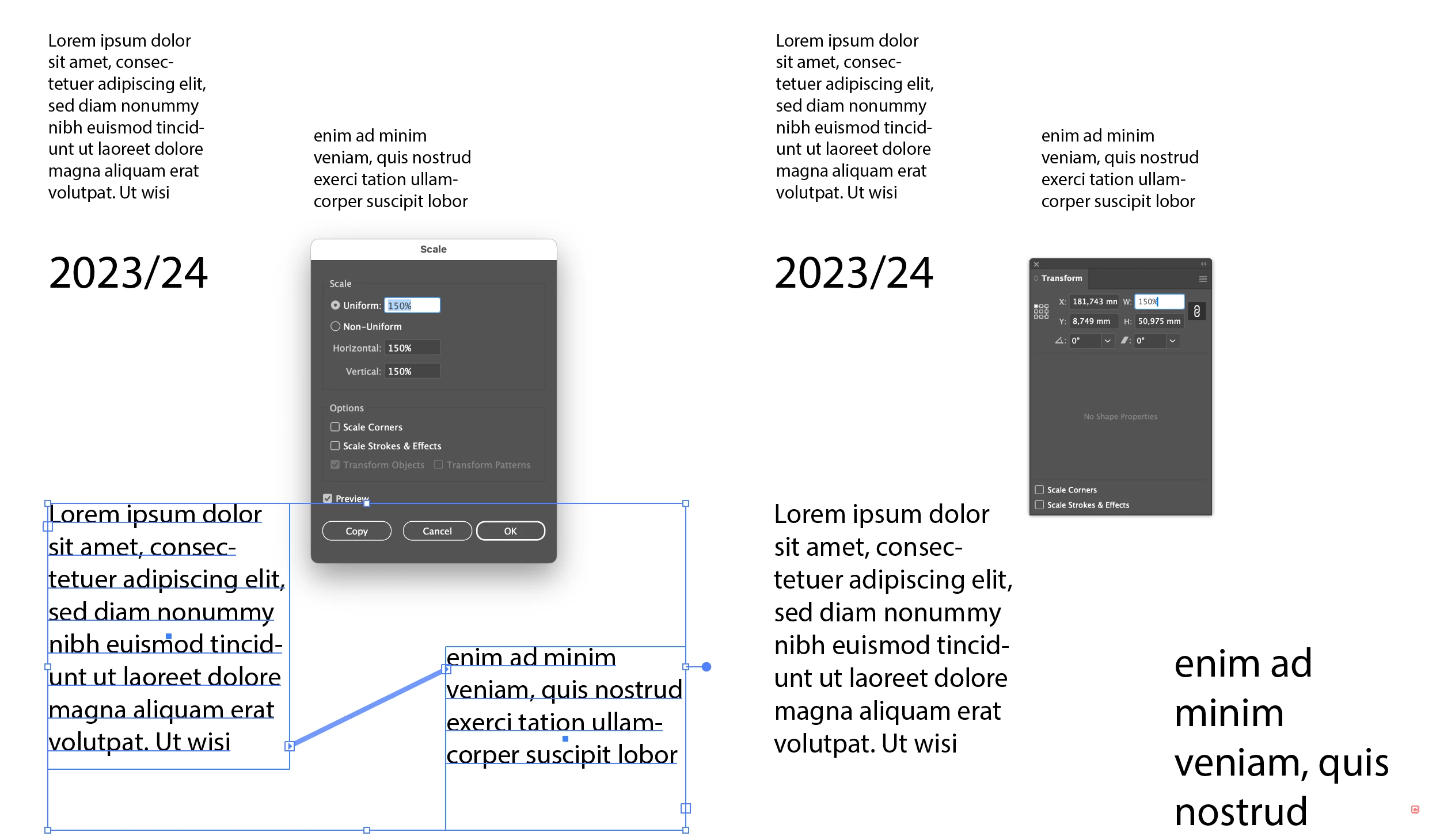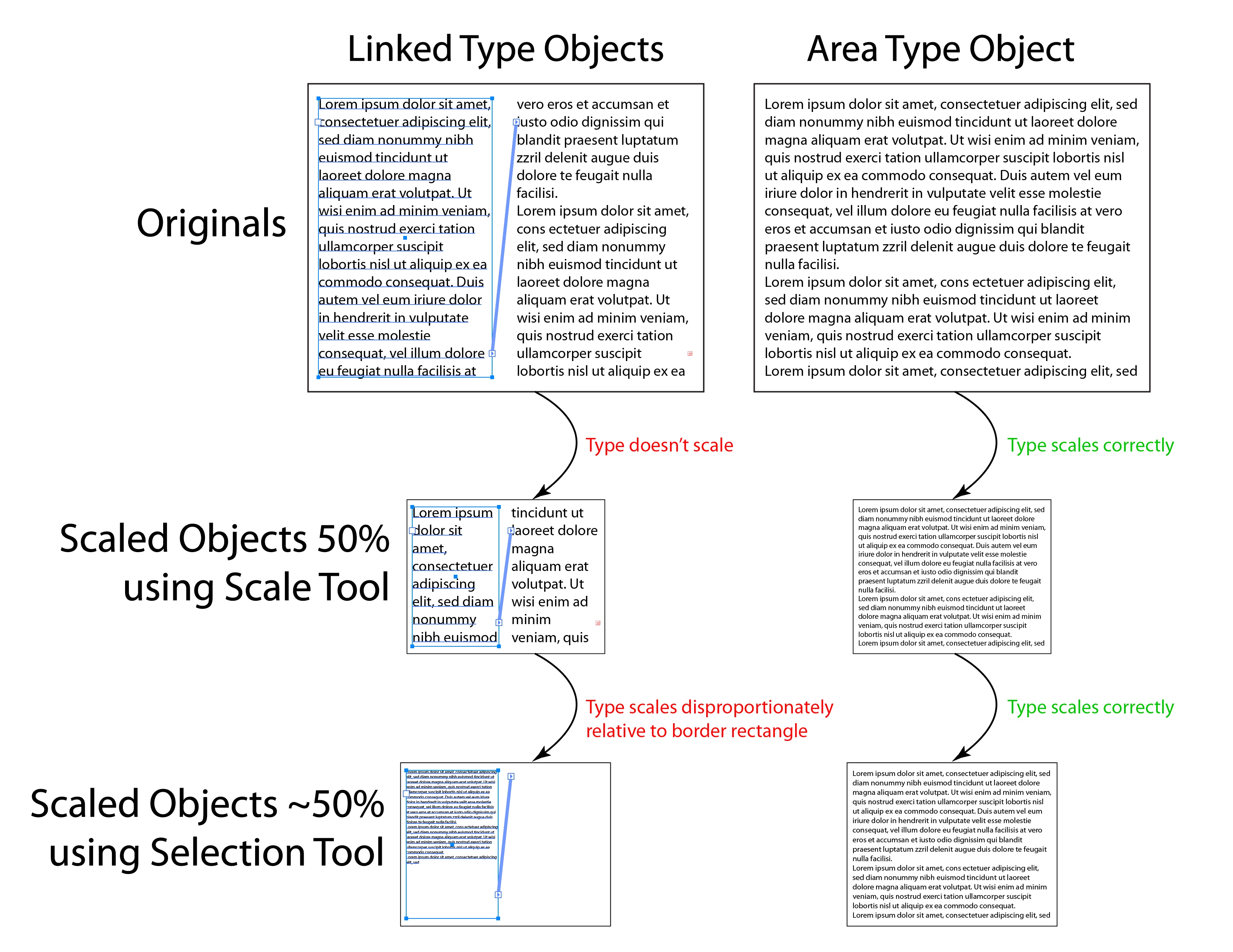 I’ve just recently started having an issue with Illustrator’s linked type objects. Often when I re-size linked type boxes, I don’t want the text inside to scale relative to the object, I just want the entire object and text to scale perfectly together. I’ve long been accustomed to creating a solid rectangle above the area type boxes (or a border), which causes Illustrator to treat the selection of multiple objects as one and scale everything. Suddenly, seemingly after the update to version 29.7.1, the linked text inside the box does not scale (using the Scale tool) or scales disproportionately (using the Selection tool).