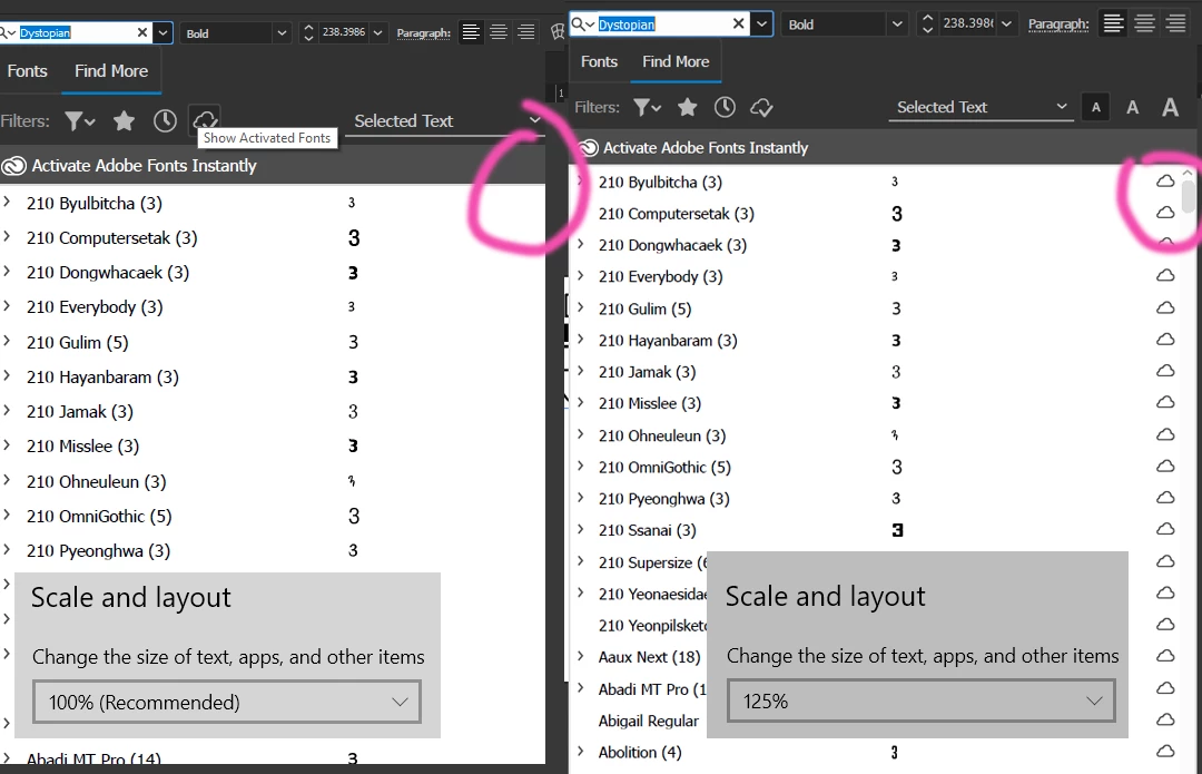 I have this problem on two laptops when connected to an external monitor. Both laptops are 15-inch Window 10 64bit. The display scale and layout suggestions for the laptops is to use 125% for more readable fonts etc. That's fine on the laptop, however, when I am connected to 21" monitor, I don't need the 125% and prefer 100% scaling. The problem is that at 100% the "activate fonts" column of the Find More Fonts menu is not there. Every time I want to activate/deactivate adobe fonts I have to change my display setting or the UI setting. I contacted support and they didn't think this was a problem and I should just change settings... but my thought is I shouldn't have to change settings to access a menu function.