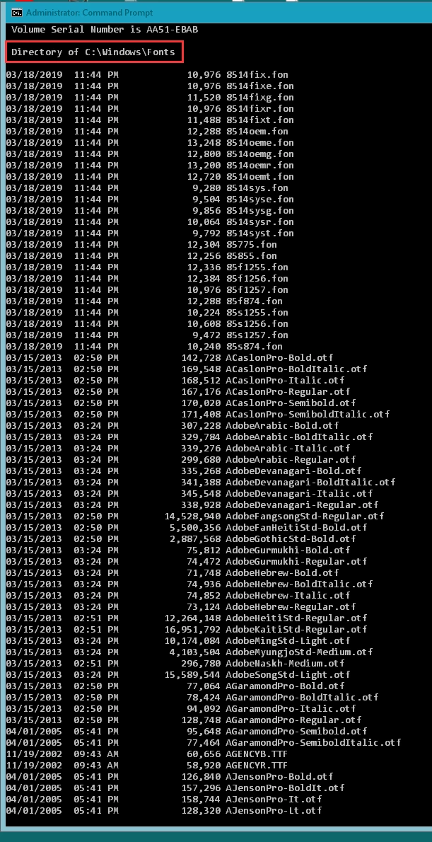 And doing a DIR in a command prompt of C:\Windows\Fonts this is what you get. No real folders like in other folders