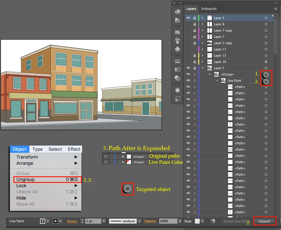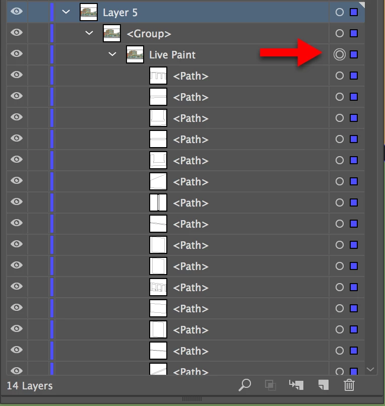 So, that would be Layer 5 > Group > Live Paint > Path, Path, etc. I need to hide one or more of these "Paths."