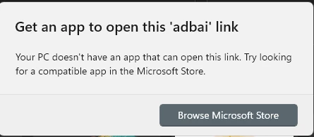 "Get an app to open this 'adbai' link. Your PC doesn't have an app that can open this link. Try looking for a compatible app in the Microsoft Store."
