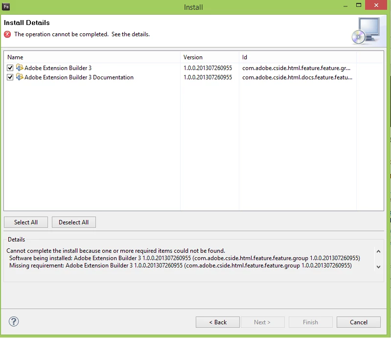 I looked for a solution online which told me to download the latest extension builder and install it through Flash Builder->Help->Install New Software but in the middle I face the following error.