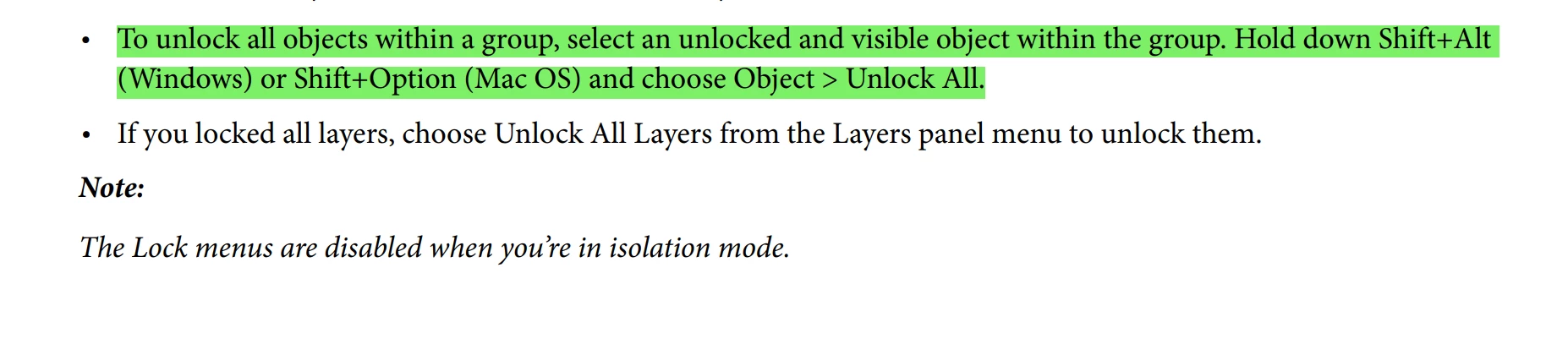 In Illustrator Referance Page 336"To unlock all objects within a group, select an unlocked and visible object within the group. Hold down Shift+Alt (Windows) or Shift+Option (Mac OS) and choose Object > Unlock All."I want to understand what is meant by it?