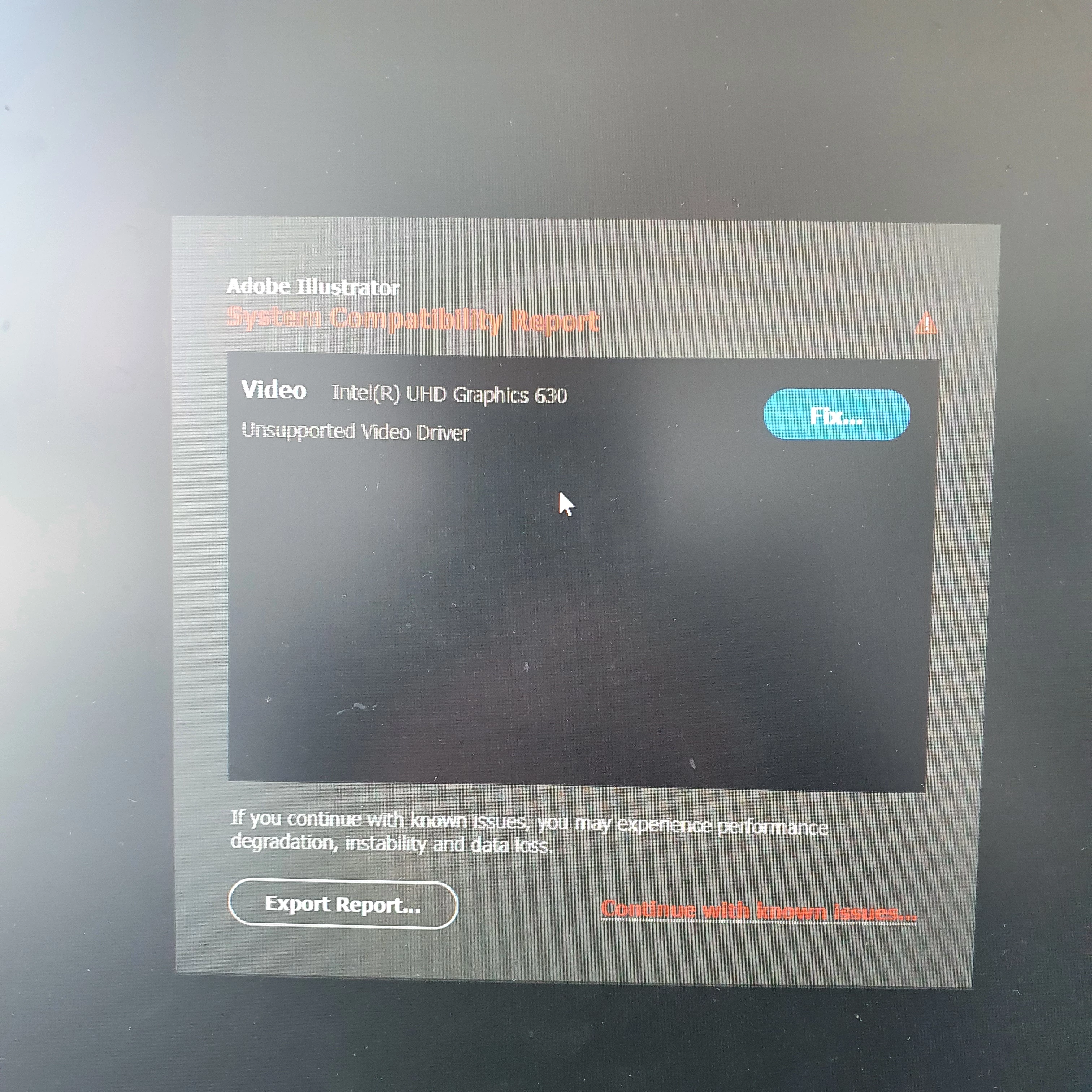 I am working on a illustrator 2021, on a lenovo yoga laptop windows 10.  Suddenly I opened Illustrator to work on an existing file and I got the message: system compatibility Report Intel HD Graphics 620 unsupported video driver.  I have repeatedly gotten the up to date driver and uninstalled and reinstalled illustrator....but still the error comes up and I have to contro alt delete to shut it down.