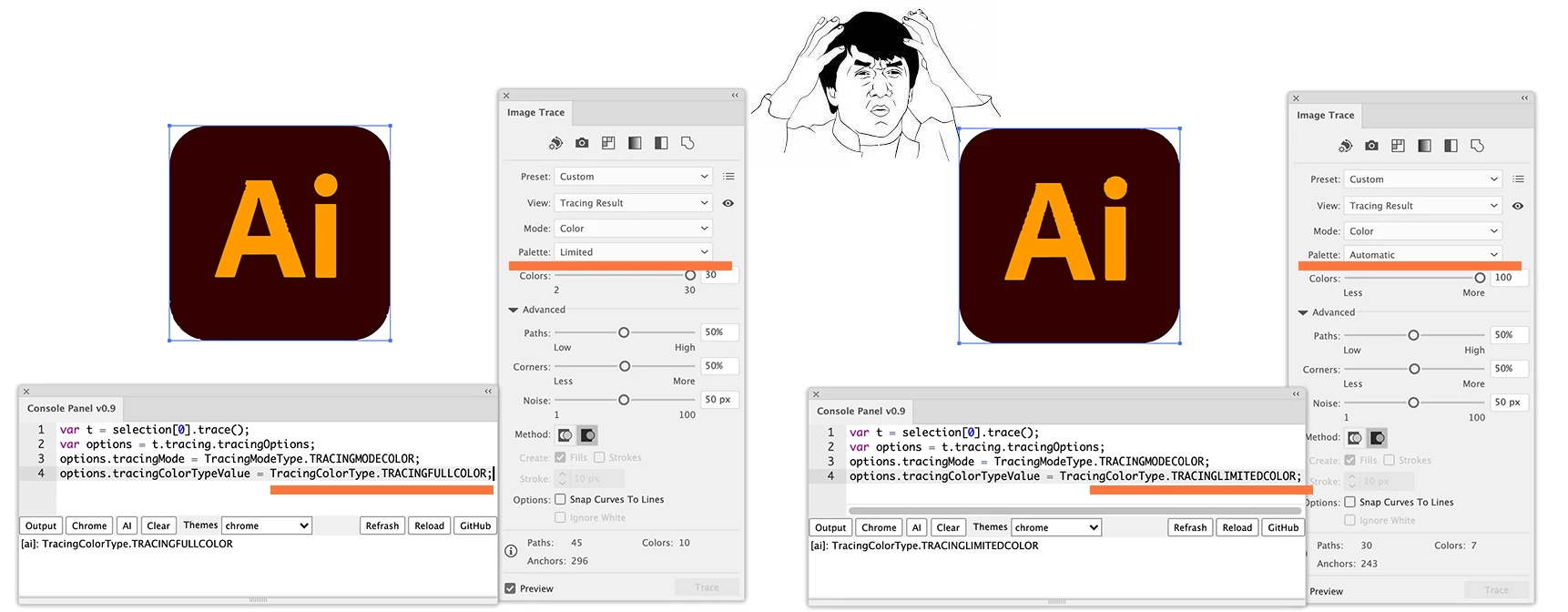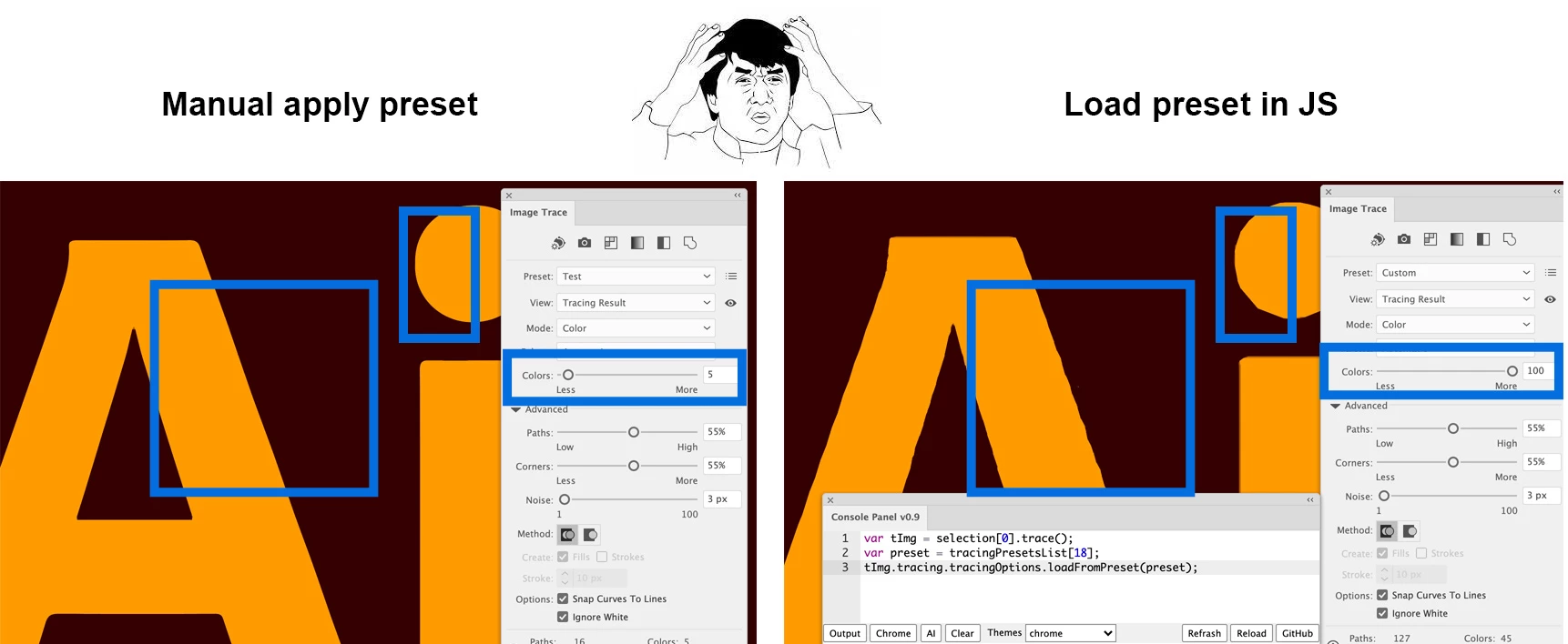 I've known for a long time that tracingColorTypeValue in the Image Trace panel doesn't set what I specify in the keys (trace-bug-1.jpg). But my client reported that the preset applied manually and the one applied by the script did not match (trace-bug-2.jpg). And this was confirmed in CC 2019, 2022, but the difference is especially noticeable with the new tracing algorithms in CC 2023.