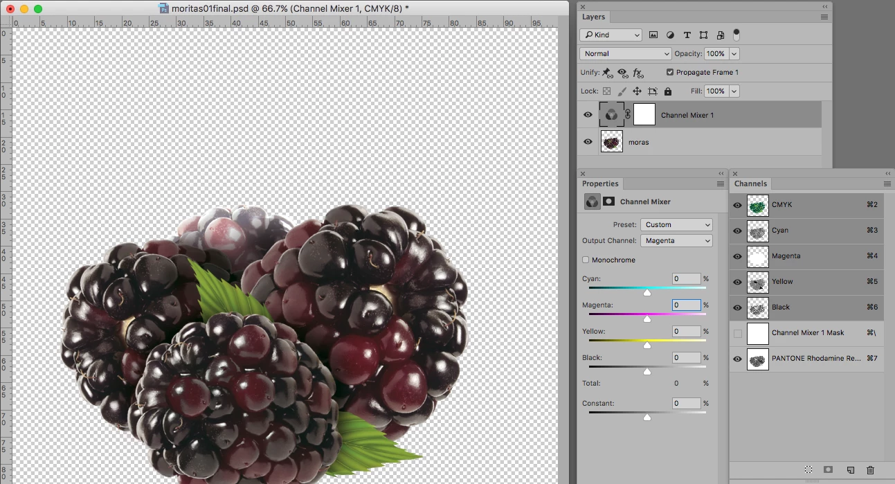 I've changed the photographic elements of the design in Photoshop to Multichannel and changed the magenta channel to Pantone Rhodamine Red and saved as a .psd file
