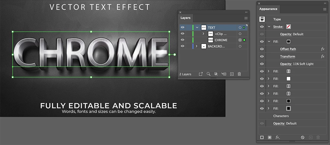 Check the Appearance panel after selecting the text CHROME object in the Layers panel.