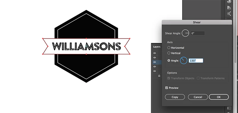 I'm try to shear an object (it's the ribbon in the photo below). When I select horizontal in the options panel, i can shear it to the angle selected, when I select vertical (which is the shear effect I want), nothing happens, nada, zilch.