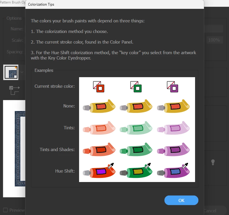 When you are using Tint, Tints and Shades, Hue Shift mode ( explained in HInt (if you click on lamp) see capture). - this allow to change a color of new created brush. With eyedropper you can pick color only from preview panel. If you choose "None" you can't change a color of new created brush.