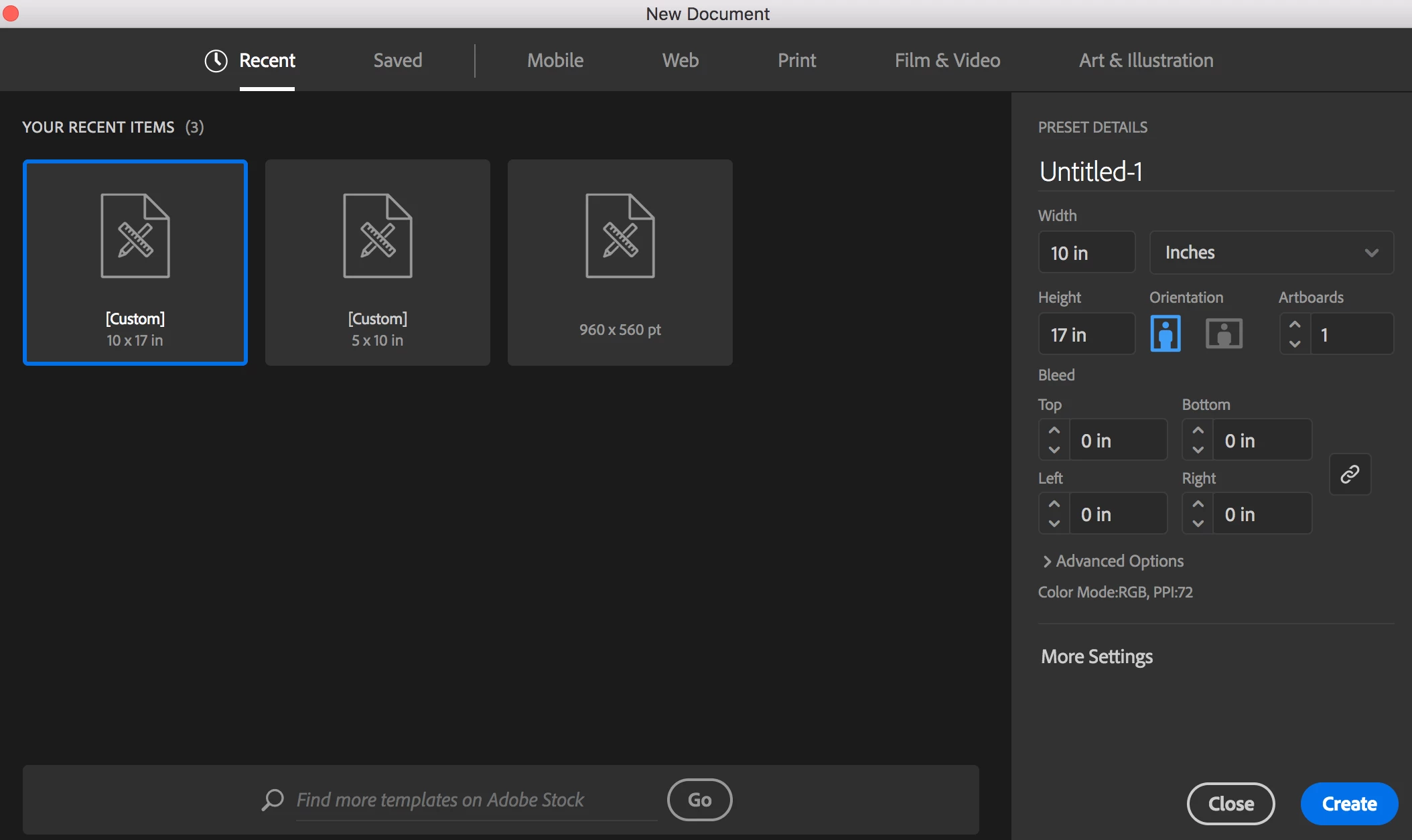 Once I'm inside the program, I click on the "create new" button to the left which brings up a popup where I can input document settings. After putting in settings, I click on OK but nothing happens. I also have tried the other way by choosing "file" at the top bar and "new." Again nothing happens! I've restarted my computer and restarted Illustrator multiple times.