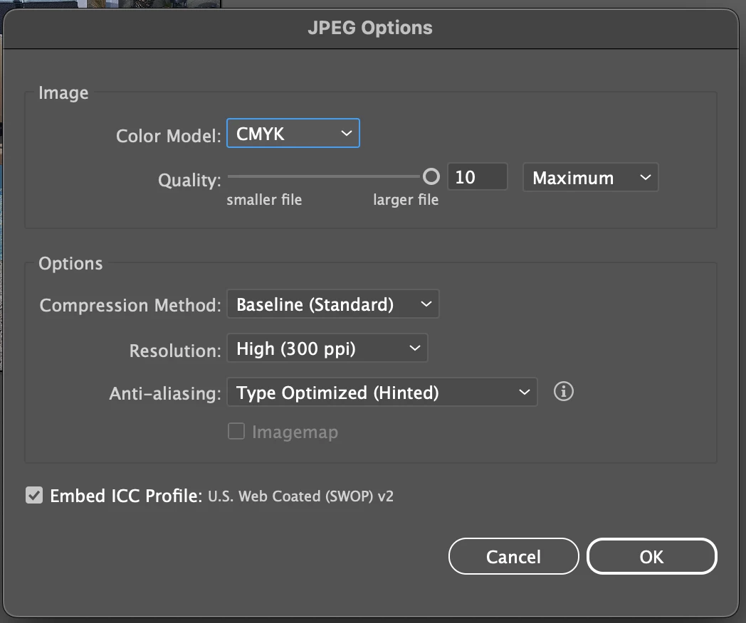 - Selected JPEG, Use Artbords, then I get the following screen where I choose CMYK 300ppi