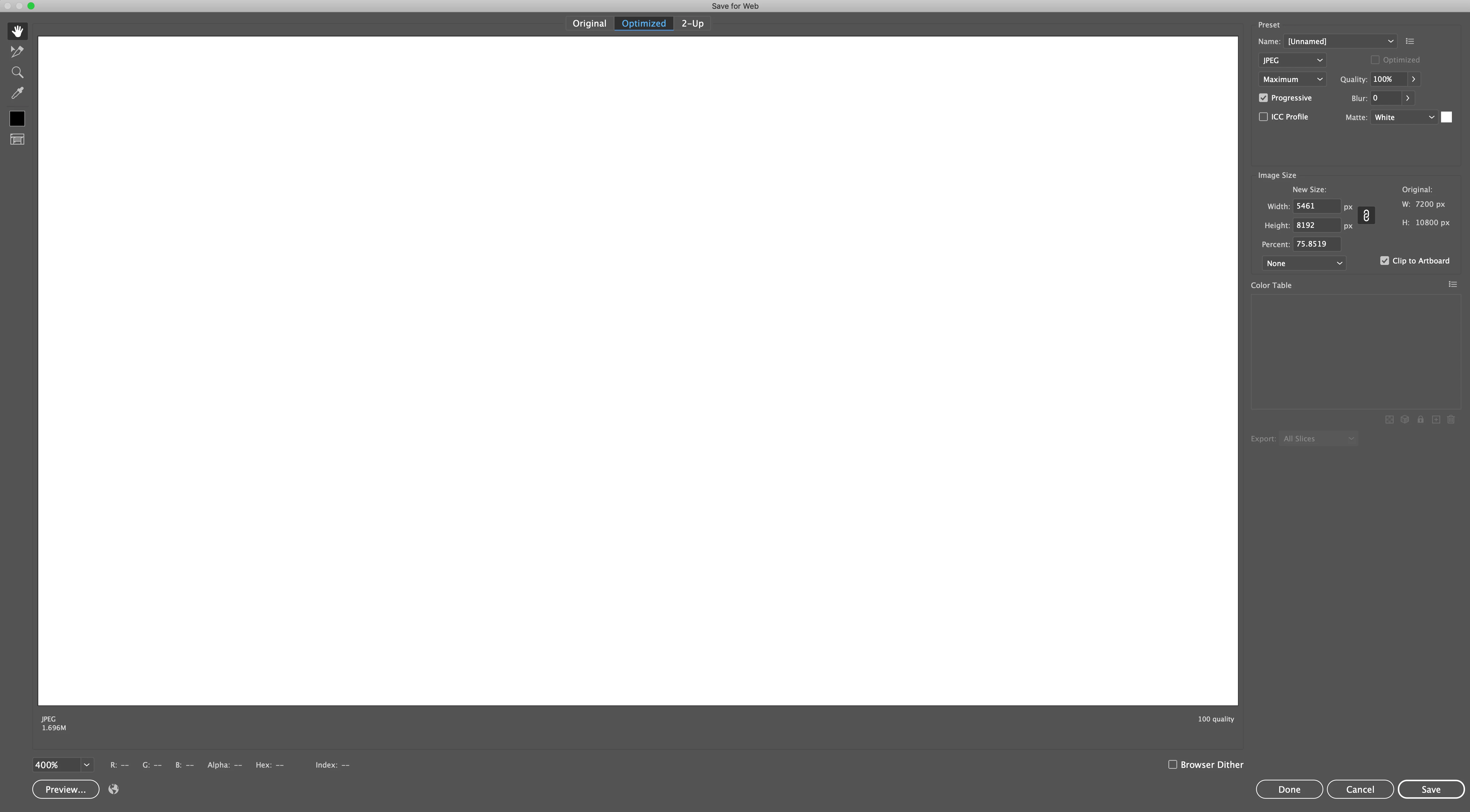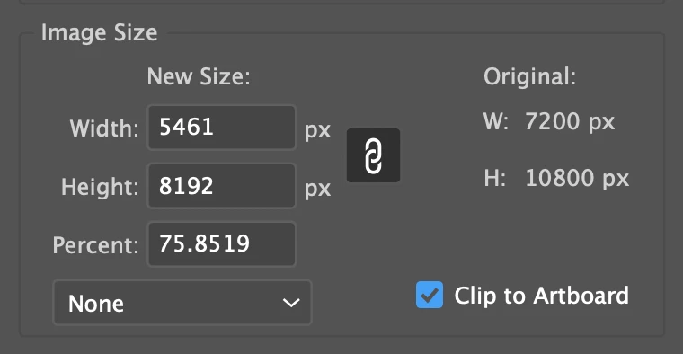 When trying to export a png using save for web at 7200x10800px, Illustrator automatically gives me a "new size" option that is significantly smaller than what I want to export. The largest I can export is 5461x8192, which is 75.8519% of the original size. I can go smaller with no problems, but when trying to go bigger it just tops out at 75.8519% for some reason. When I try exporting for screens, I just get an error message saying it can't export because of an unknown error.