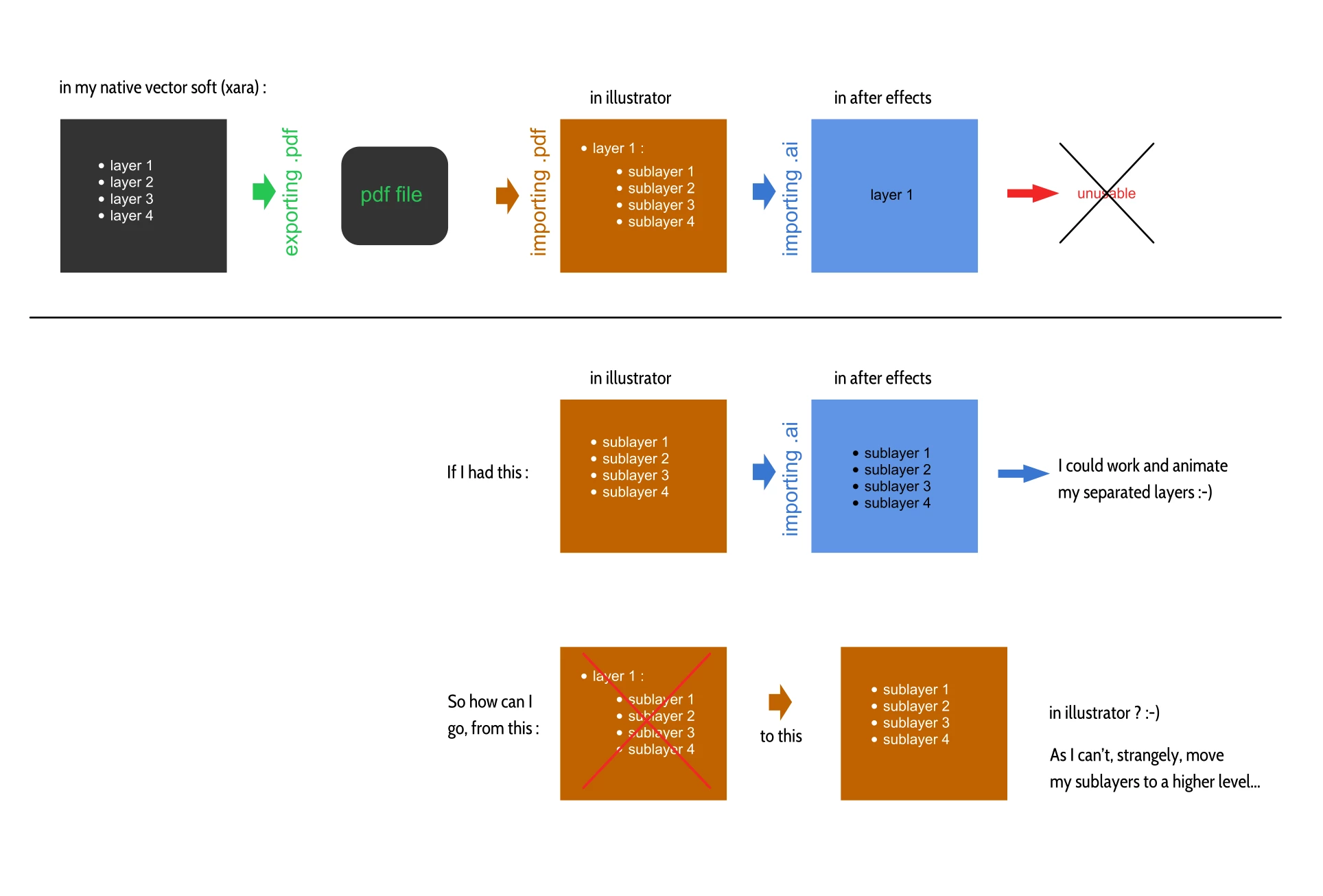 My goal is to prepare this file in illustrator (rename some layers, rework them, ...), to then import it into After Effects, for a small animation of 10-15 seconds. But once I open the pdf in illustrator, all of my layers seem to be actually sublayers of a "layer 1" that I can't get rid of. We see on the image below that I have a selection of my sublayers: it is impossible for me to move it between layer 4 and layer 1.