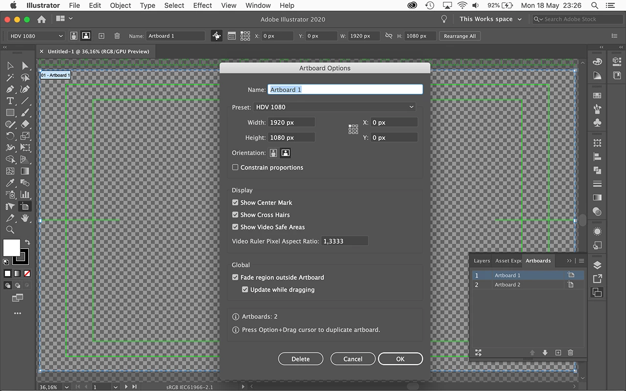 Working with Video Presets (HTV/HDTV 1080) in Illustrator.