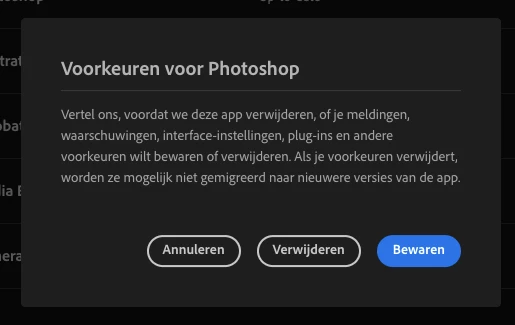 ( I attached the popup I get for reference, it's in Dutch but this is what it asked me before erasing my preferences anyway )