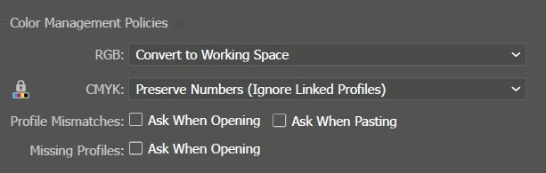 - Set "CMYK" to "Preserve Embedded Profiles".