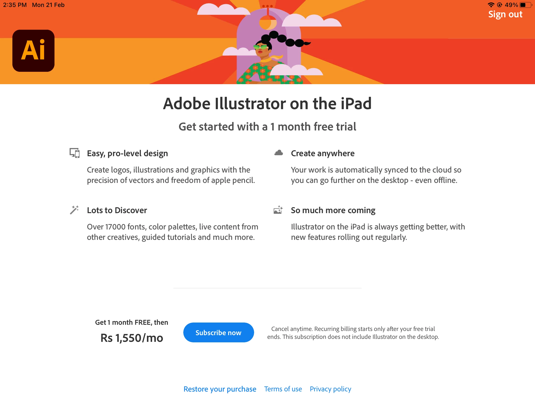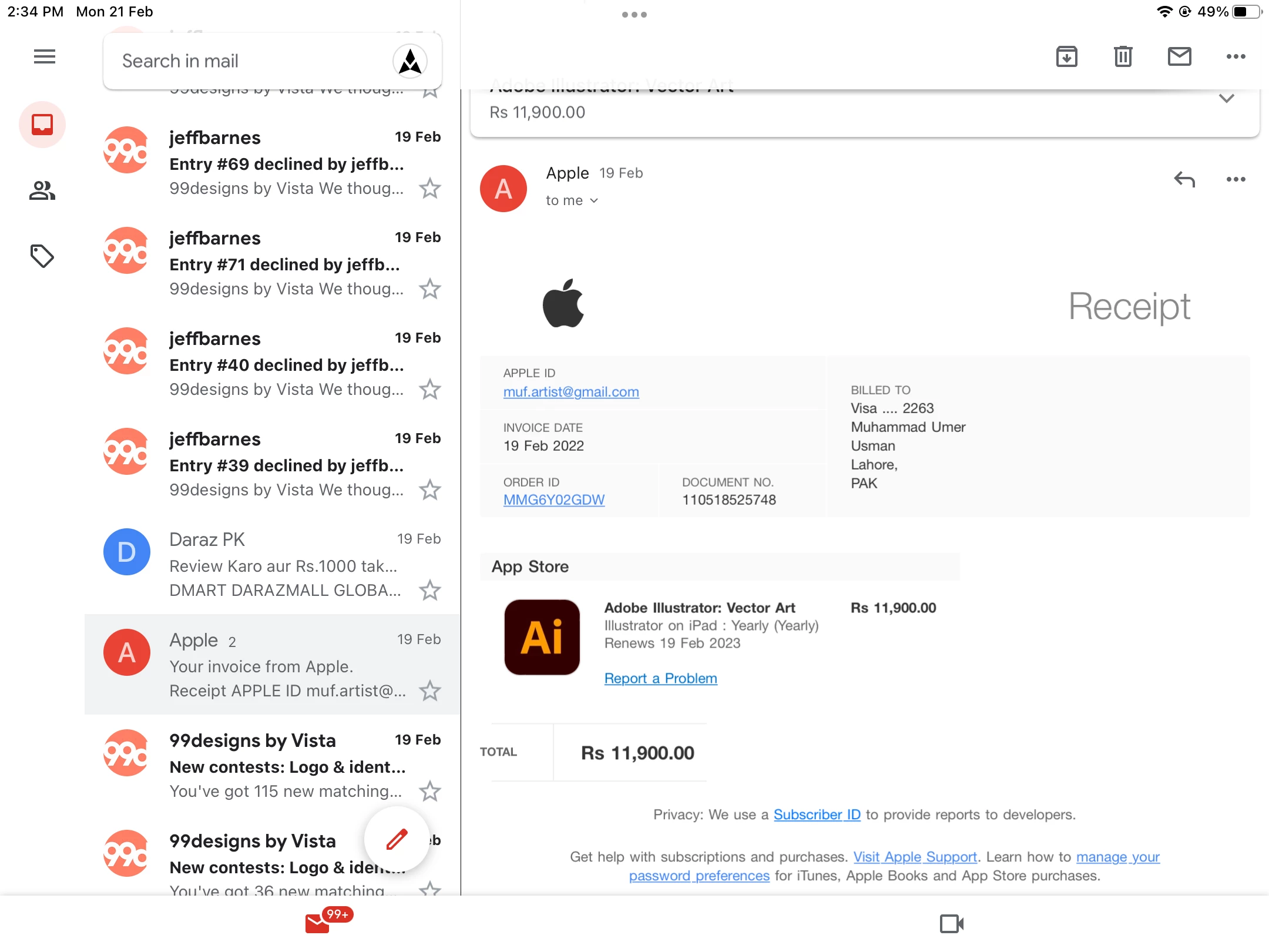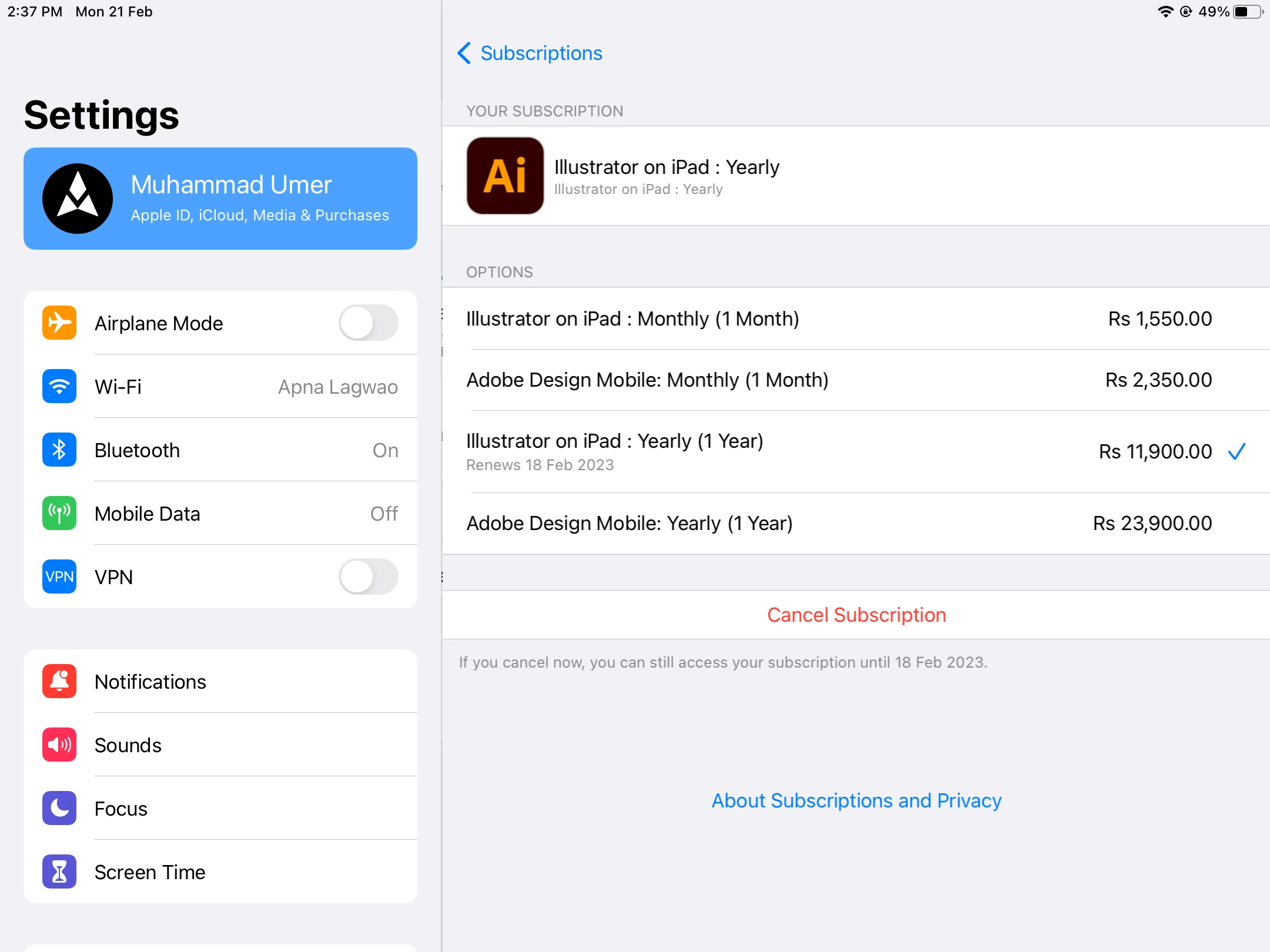 I received an annual Adobe Illustrator subscription via iPad on February 19th 2022 Which I bought for eleven thousand nine hundred Pakistani rupees, For a couple of days I used Adobe Illustrator properly, But on February 21 20, when I turned on Adobe Illustrator, I was asked to buy a subscription again.