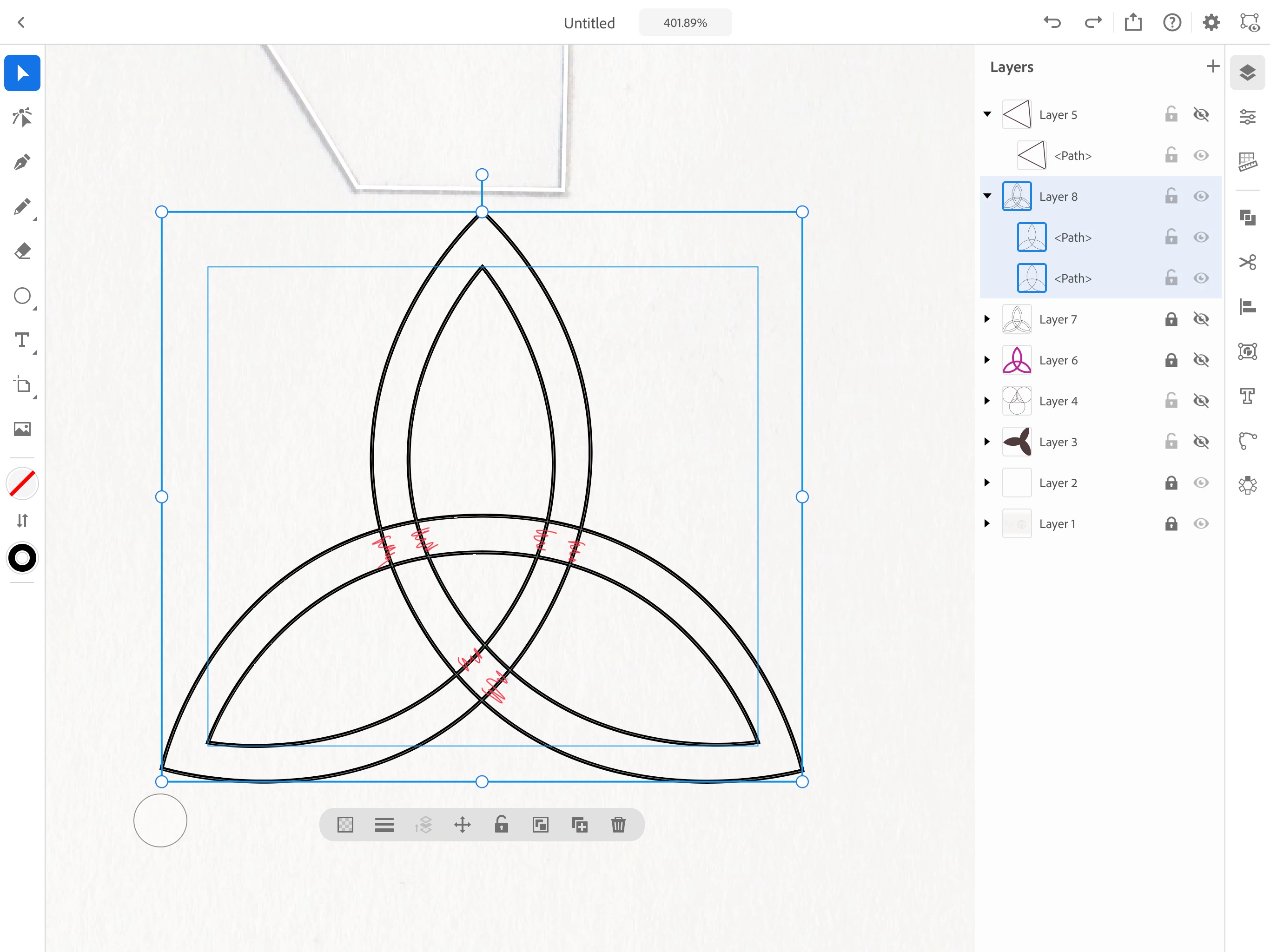 What is the easiest way to delete the intersecting Paths of layer 8, indicated in red below? As you can see in this case the outer shape is one path and the inner shape is another... Thanks, i can't for the life of me figure this out.