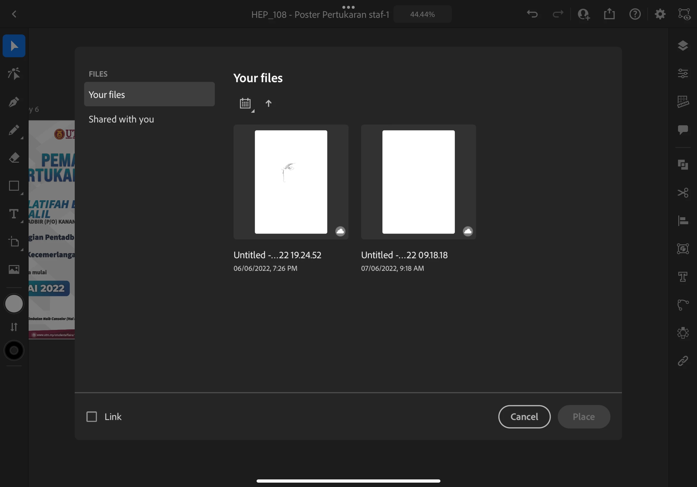 Hi, I m facing a problem which when i downloaded my AI files from another cloud and open it, there is a few missing image which i had dowloaded all the assets ad place it inside of my ipad memory and creative cloud. However when i try to relink the files or when i try to place something, only this two option that appear and there is only this two files that appear. The files that appear are PSDC files while the other format did not appear. How do i solve this so that my ipad can import a file from my ipad or creative cloud. Thanks