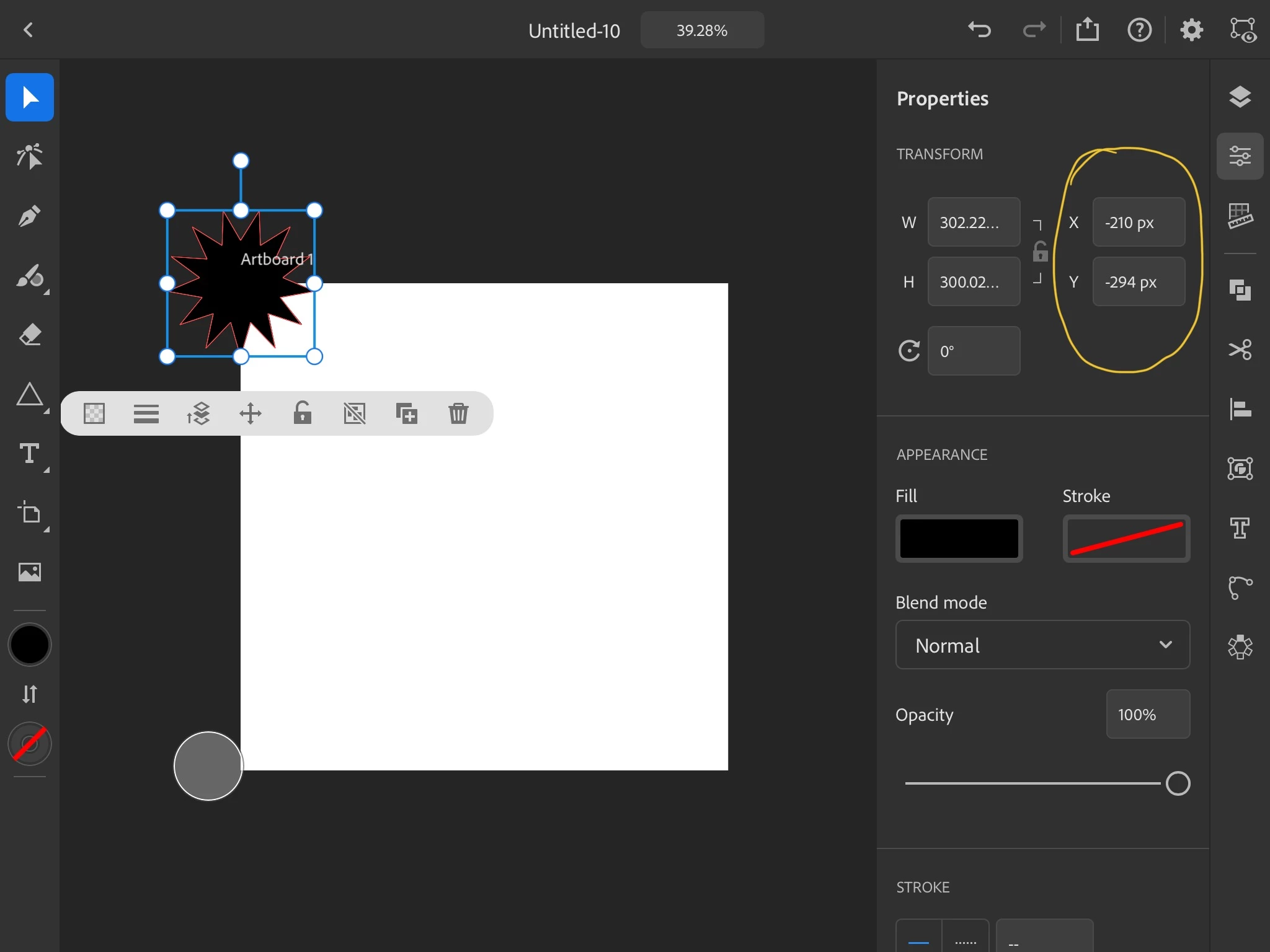 I use illustrator primarily to make repeat patterns. I know the Illustrator app on the iPad has a pattern tool to help make patterns, but I want to create more detailed patterns so I wanted to use traditional techniques to make repeat patterns. On the desktop version, I was able to easily do that by using the move tool to tell an object to move a certain distance so all objects that hang over the edge will be repeated on the other side of the art board. With the app, I thought I was going to be able to use the transform tool, however, as seen in the picture, I moved the object to the corner and instead of reading 0,0 as it did when I first created an object it reads -210,-294. My art board is 1000 x 1000 px so ideally I would need to move the object 1000 px to the right. My though is the transform tool measures how far you moved the object and not where your object is on the art board. Is there anything in the app that is like the move tool on the desktop version?