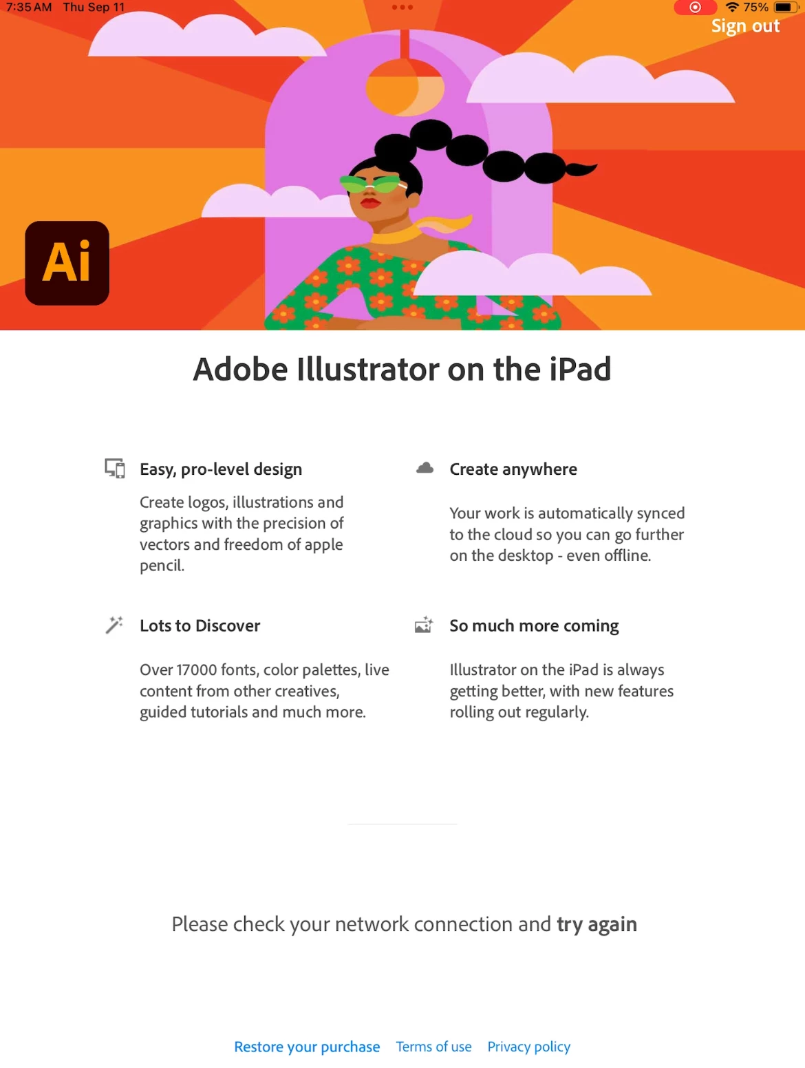Hi I can not use illustrator on my iPad any more! It opens with message 'check network connection and try again'- the network is connected and working well- its a strong wifi too- the iPad has been updated to the latest IOS 16.6.1, I have deleted and re downloaded the app so it is definitely up to date, I have restarted the iPad, logged out and in (many times) and it is still showing the same message and i am unable to open new or old pages! Any advice on how to fix this error much appreciated, Thanks!