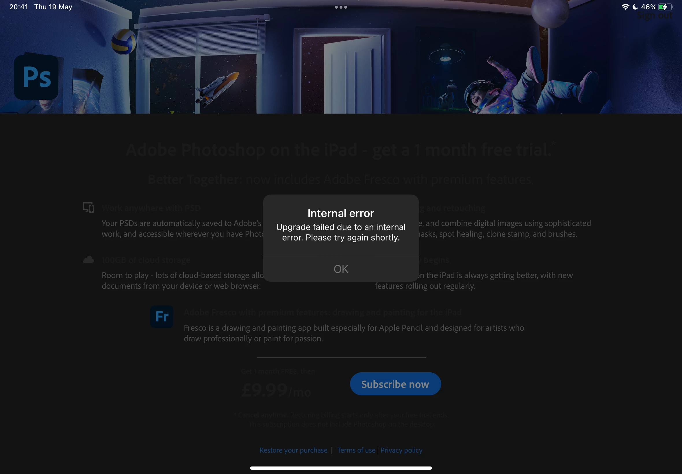 I was already subscribed, since signing in it tells me it's fetching my subscription details with a box behind it saying app already purchased and then it takes me and leaves me stuck on the get started with a 1 month free trial page. Have clicked restore purchase and nothing happens and I've clicked subscribe now (again) and nothing happens. I have googled everything about making sure the right account and Apple ID is connected, i have also just now bought the extra £20 illustrator think it's turned out to be the desktop app (im on iPad) thought if I bought that my app would work. It doesn't.