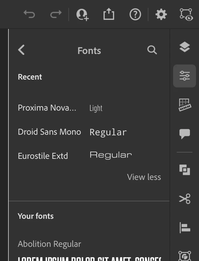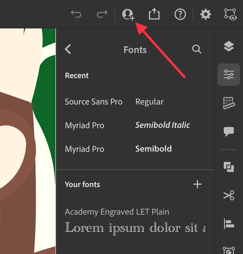 For reference, here's what I see (below). I have a full subscription, and I see the share icon. I wonder if your subscription type maybe doesn't support adding your own fonts?