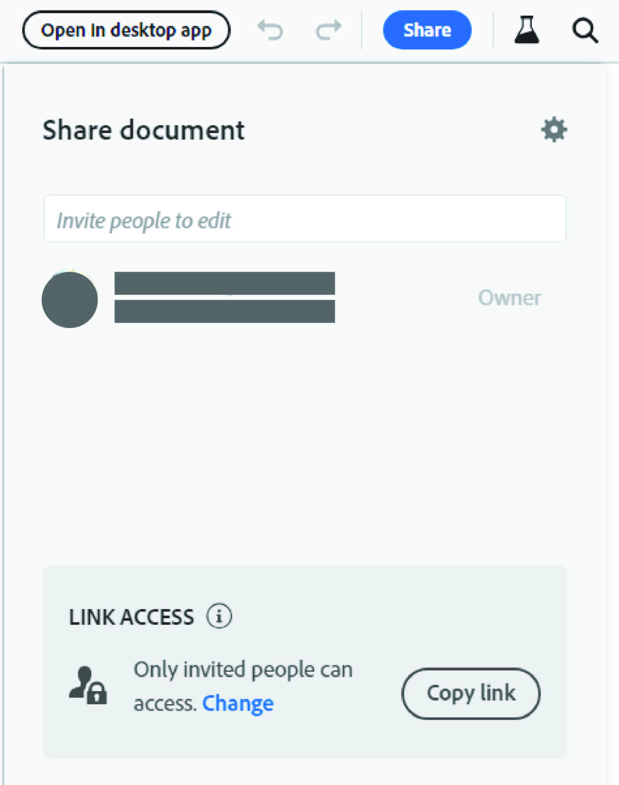 Invite people. This action will open the "Invite to Edit" panel, allowing you to add collaborators by entering their Adobe ID (email address).