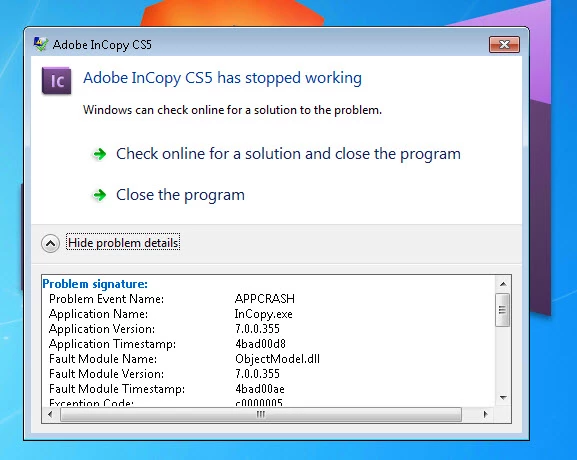 Every launch of InCopy CS5 on a Win7 x64 machine I get this crash error.