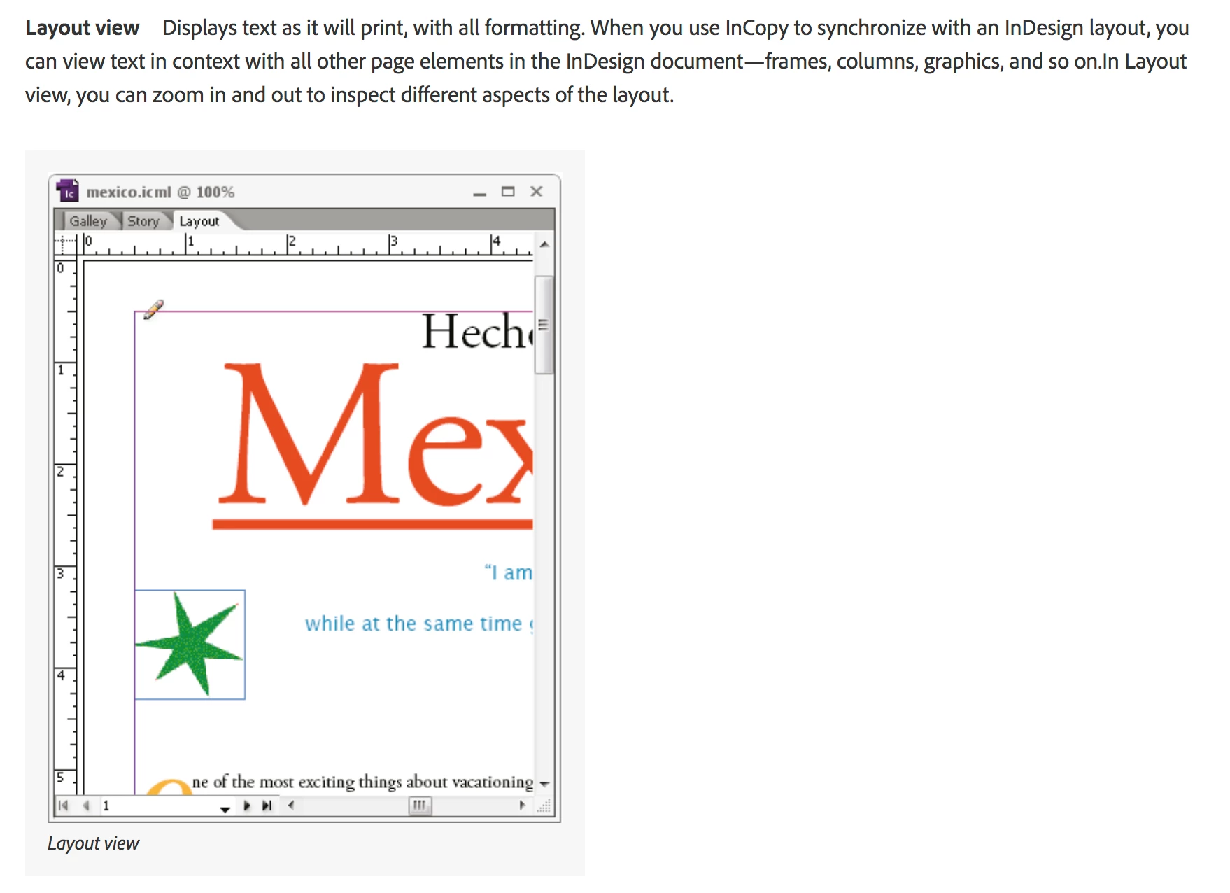 The Help file screen shot is incorrect. Yes you can open an ICML file (as shown) in InCopy, and in Layout view you can see the formatting of the text, but you won't see the story within the context of the design. The default page size for any ICML file in InCopy is letter size. But opening ICML files in InCopy is not commonly done; just for a couple special workflows.